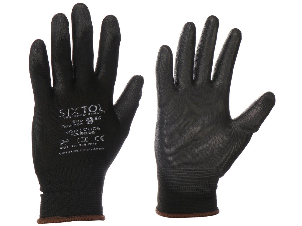 Pracovní rukavice z polyesteru polomáčené v polyuretanu SIXTOL GLOVE PE-PU 9, černé, velikost 9" SIXTOL
