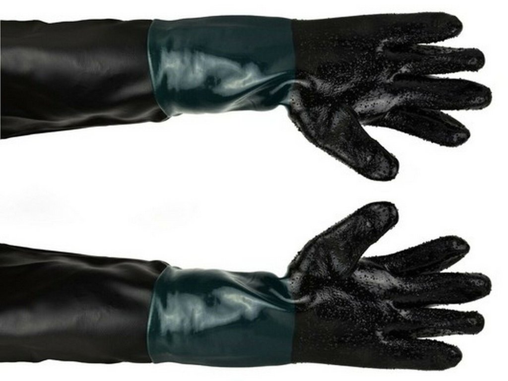 Rukavice pro pískování z pryže, vinylové a umělé kůže. Drsná pracovní část umožňuje spolehlivější uchopení obrobku.