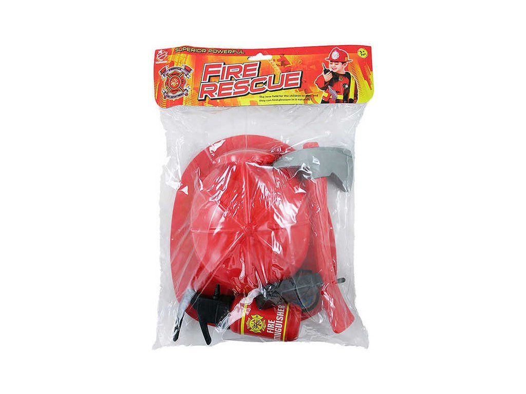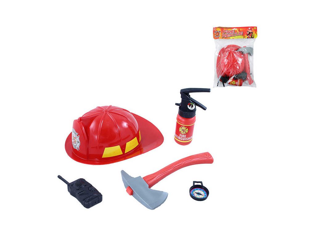 Sada obsahuje: helma s odznakem a reflexními symboly, hasičská sekera, hasicí přístroj, vysílačka a kompas.
