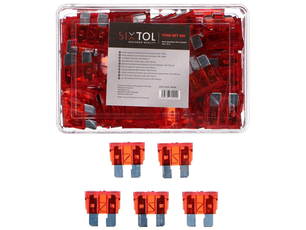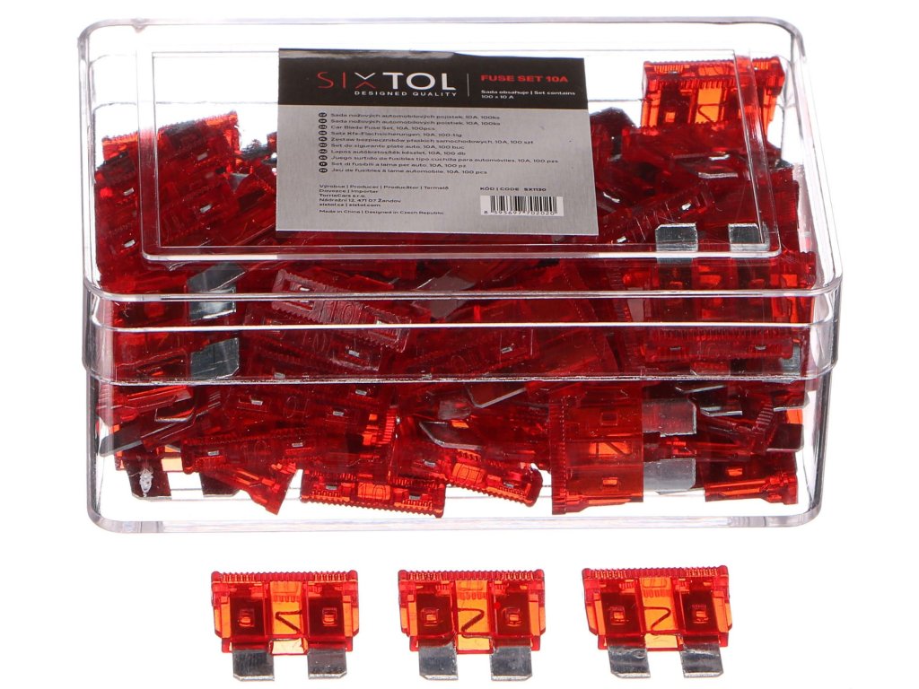 Praktická sada standardních automobilových pojistek SIXTOL FUSE SET, které najdou využití v každém běžném vozidle nebo motocyklu. Sada obsahuje 100 kusů nožových pojistek o jmenovitém výkonu 10 A, které jsou rozlišeny červenou barvou. Pojistky jsou vyrobeny v souladu s normou ISO8820. Každá pojistka je z horní strany označena příslušným jmenovitým proudem, aby bylo snadné pojistky rozlišit. Celá sada je uložena v praktickém plastovém pouzdru s přihrádkami.
