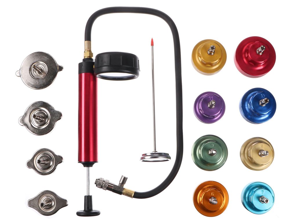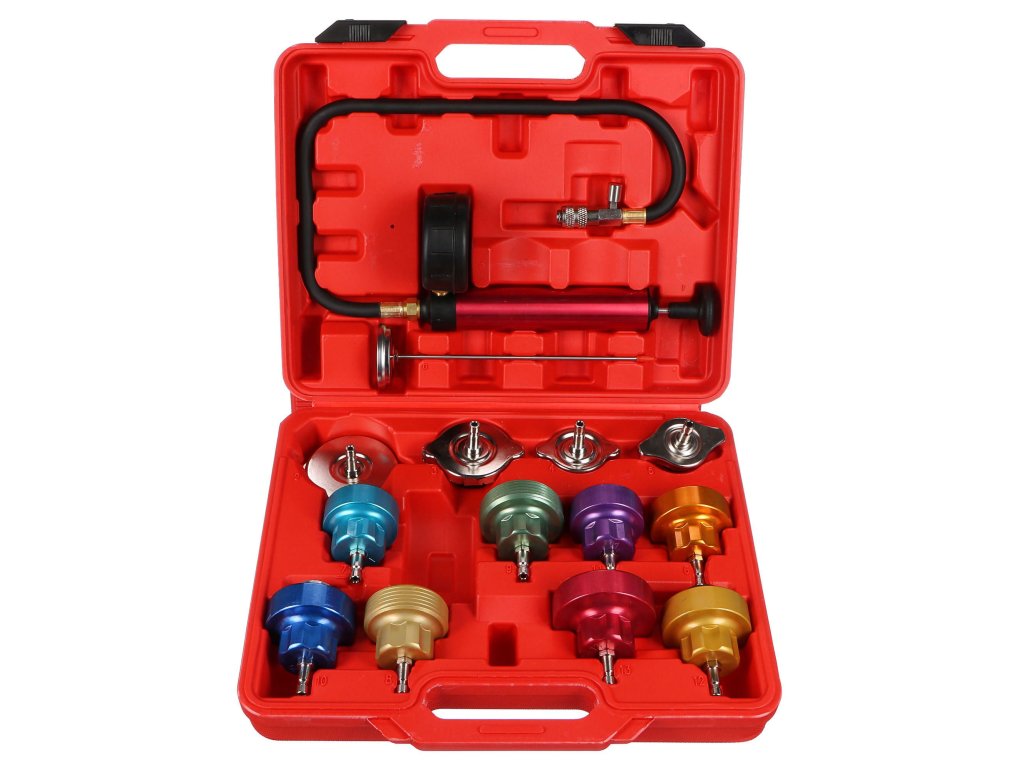Servisní 14dílná sada k rychlé kontrole těsnosti chladícího systému automobilů SIXTOL MECHANIC COOLING TESTER 14 s analogovým manometrem se stupnicí 0-2,5 bar a 0-35 psi. Sada obsahuje 12 nástavců a adaptérů pro různé značky vozů a teploměr pro měření teploty chladící kapaliny se stupnicí 0-200 °C a 0-400 °F. Nástroje jsou uloženy v plastovém kufříku, který usnadňuje jejich skladování a přenos.