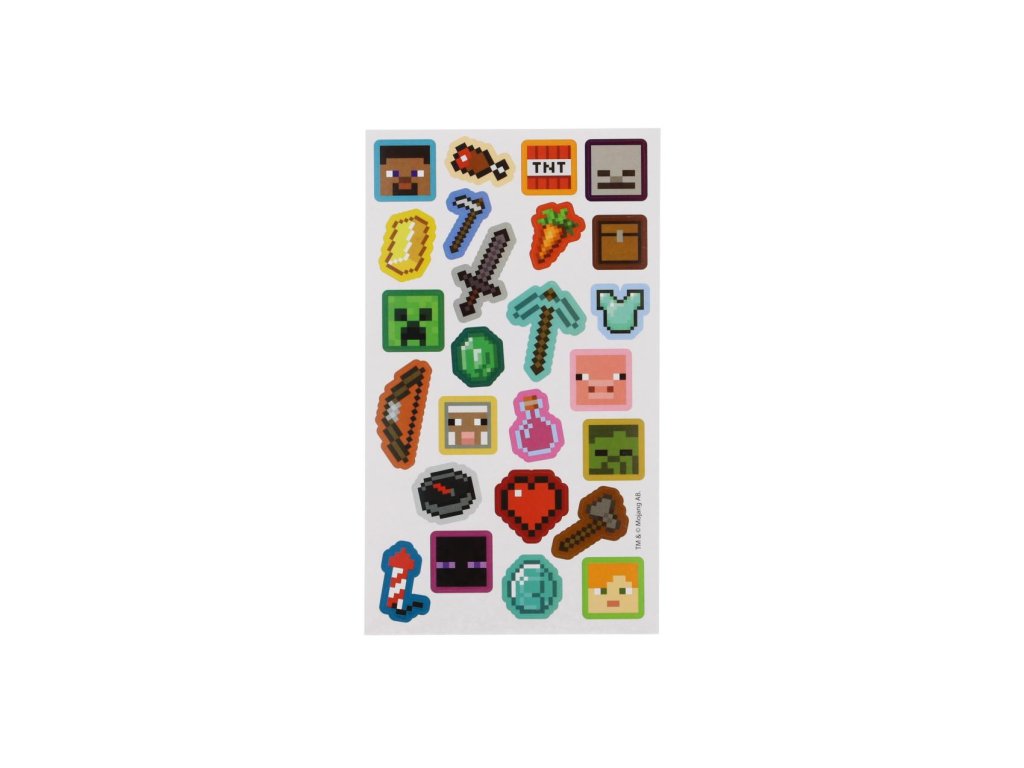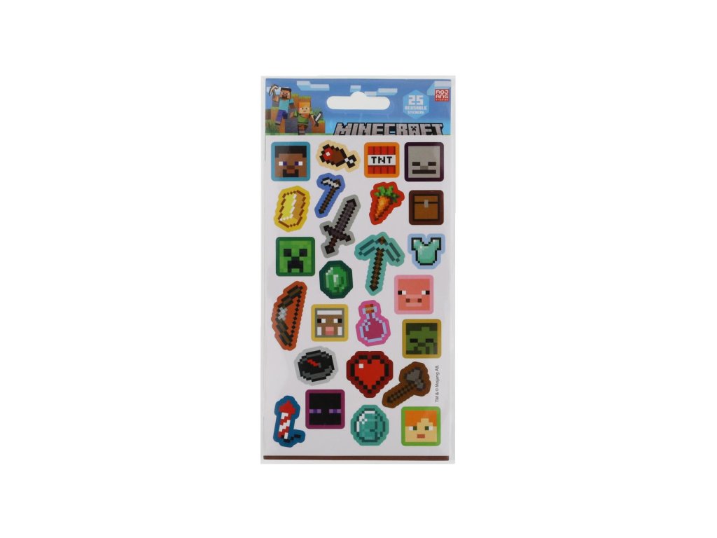 Opakovaně použitelné samolepky s licenčním motivem. Arch obsahuje 25 ks samolepek. Velikost archu 19,5 × 9,5 cm. Samolepky v originálním herním stylu přinesou kousek dobrodružství Minecraftu i do skutečného světa.