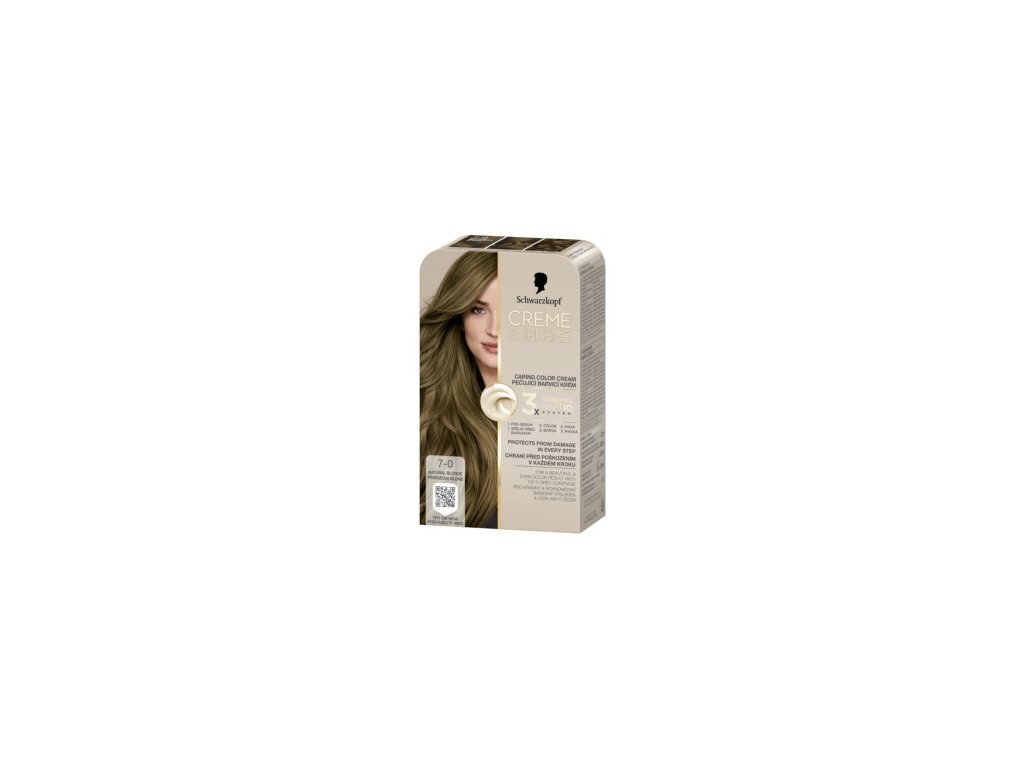 Permanentní barva na vlasy Schwarzkopf Creme Supreme 7-0 nabízí přirozený, teplý odstín středně světlé blond. Díky inovativní technologii Bonding HaptIQ poskytuje intenzivní ochranu a péči během barvení, čímž zajišťuje krásný a rovnoměrný barevný výsledek s až 100% krytím šedin.