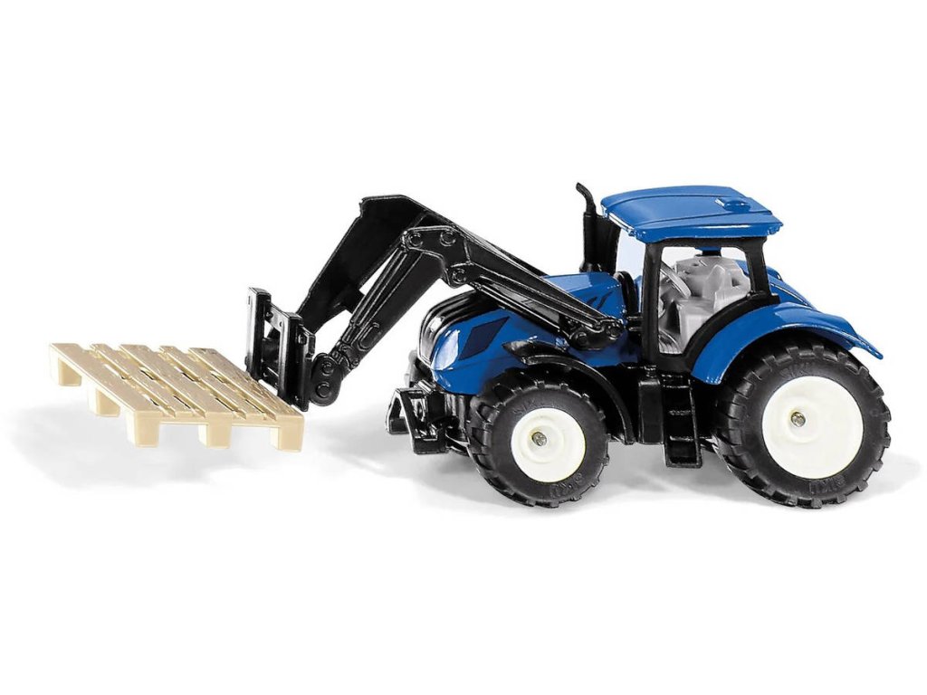 SIKU Blister – traktor New Holland s paletovými vidlemi a paletou. Skládejte paletové klece obsahující palivové dřevo a přepravujte bedny s ovocem a zeleninou. Traktor je vybaven vidlemi na palety a díky čelnímu nakladači může nahradit vysokozdvižný vozík. Čelním nakladačem traktoru New Holland lze pohybovat nahoru a dolů a lze také demontovat kabinu. Všechny přívěsy siku lze připojit ke spojce přívěsu. Traktor jezdí na pogumovaných pneumatikách a je v typickém designu New Holland.