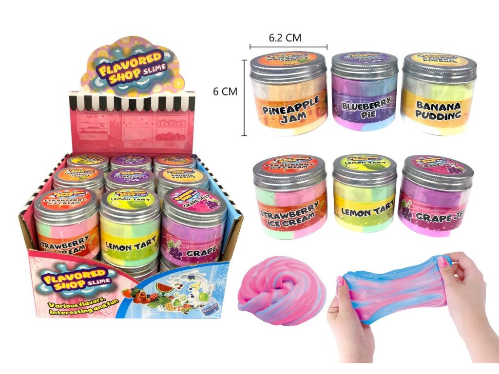 Duhové barevné provedení s atraktivním vzhledem. Různé varianty s motivy oblíbených příchutí (např. jahodová zmrzlina, borůvkový koláč, banánový puding, ananasový džem, citronový koláč, hroznový džem). Praktická uzavíratelná dóza (cca 6 × 6,2 cm) – sliz nevysychá.