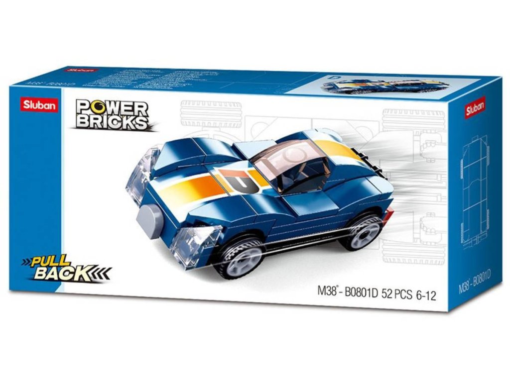 SLUBAN M38-B0801D Auto modrý sporťák na zpětný chod z edice Power Bricks. Kvalitní plastová stavebnice. 52 dílků. Lze kombinovat s většinou ostatních známých stavebnic.