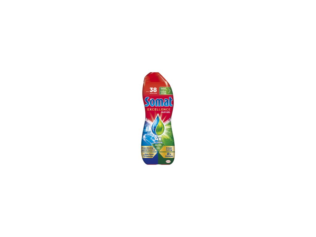Ochrana proti skvrnám od vodního kamene. Somat Excellence Duo Gel - naše nejlepší složení Somat gelu zajišťuje účinné čištění a brilantní lesk i při nízkých teplotách na eco a krátké programy. Jedinečná kombinace dvou doplňujících se receptur poskytuje hloubkové čištění připálenin a silné odmašťovací účinky. Pro okamžitý efekt a extra lesk nádobí. I při nízkých teplotách na eco a krátké programy zanechá za sebou oslnivě čisté nádobí bez usazenin.