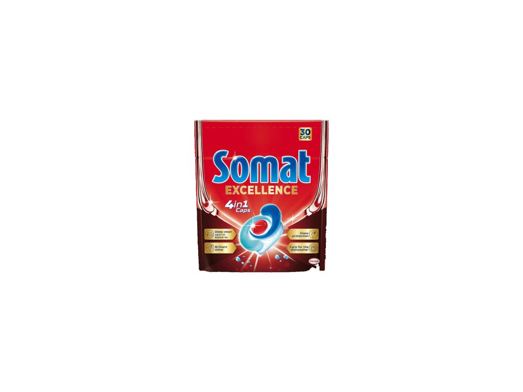 Somat Excellence 4v1 kapsle na mytí nádobí obsahují prémiový multifunkční prostředek na mytí nádobí vyrobený z prášku v kombinaci se 3 jedinečnými pevnými gelovými komorami v biologicky odbouratelné fólii rozpustné ve vodě.