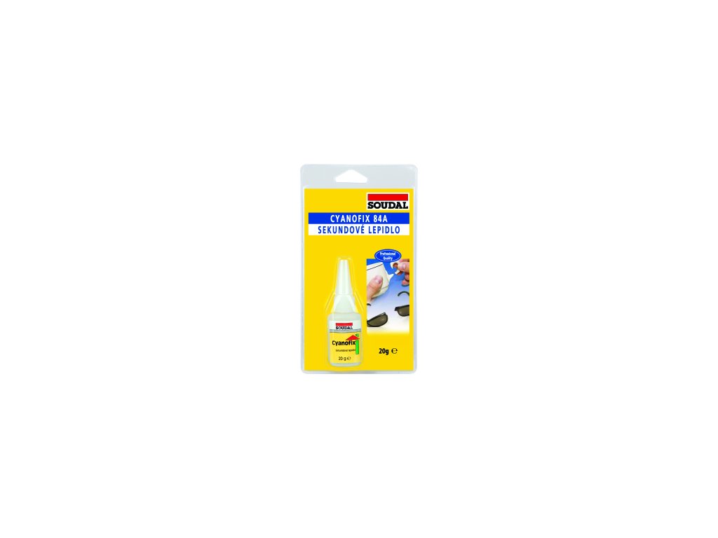 Soudal Cyanofix 84A vteřinové lepidlo lepí během několika sekund většinu materiálů jako porcelán, sklo, gumu, kovy, většinu plastů, atd. Vhodné pro běžné rychlé opravy v domácnosti i pro průmyslové použití. Vysoce kvalitní sekundové lepidlo s velmi rychlým tuhnutím a vysokou lepicí silou. Lepidlo ihned reaguje po stlačení lepených předmětů k sobě a vytěsnění vzduchu. Silná přilnavost, rychleschnoucí (cca 1 min.). Lepí během několika sekund většinu hladkých materiálů, běžné rychlé opravy, vhodné na porcelán, sklo, gumu, kovy, většinu plastů, atd., nepoužívat na PE, PP, PTFE.