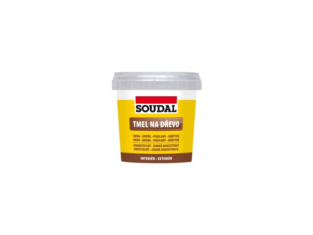 Soudal tmel na dřevo je vhodný pro vyrovnávání dřevěných, dřevotřískových, cemento-třískových a ostatních savých podkladů, lokální opravy a tmelení děr, prasklin a nerovností, zarovnávání stykových spár v lištových a deskových spojích, vyrovnávání ploch pod nátěry emailem. Tmel na dřevo velmi dobře přilne na dřevo a ostatní savé materiály, po vytvrzení je objemově stálý a snadno brousitelný. Pro exteriérové aplikace nutno opatřit nátěrem. Dobře zpracovatelná pastovitá konzistence. Ředitelný a čistitelný vodou. Vyrovnávání dřevěných povrchů, lokální opravy a tmelení vrypů, děr a prasklin, spáry spojů dřevěných lišt a desek, plošné vyrovnávání dřevěných ploch před nátěrem.