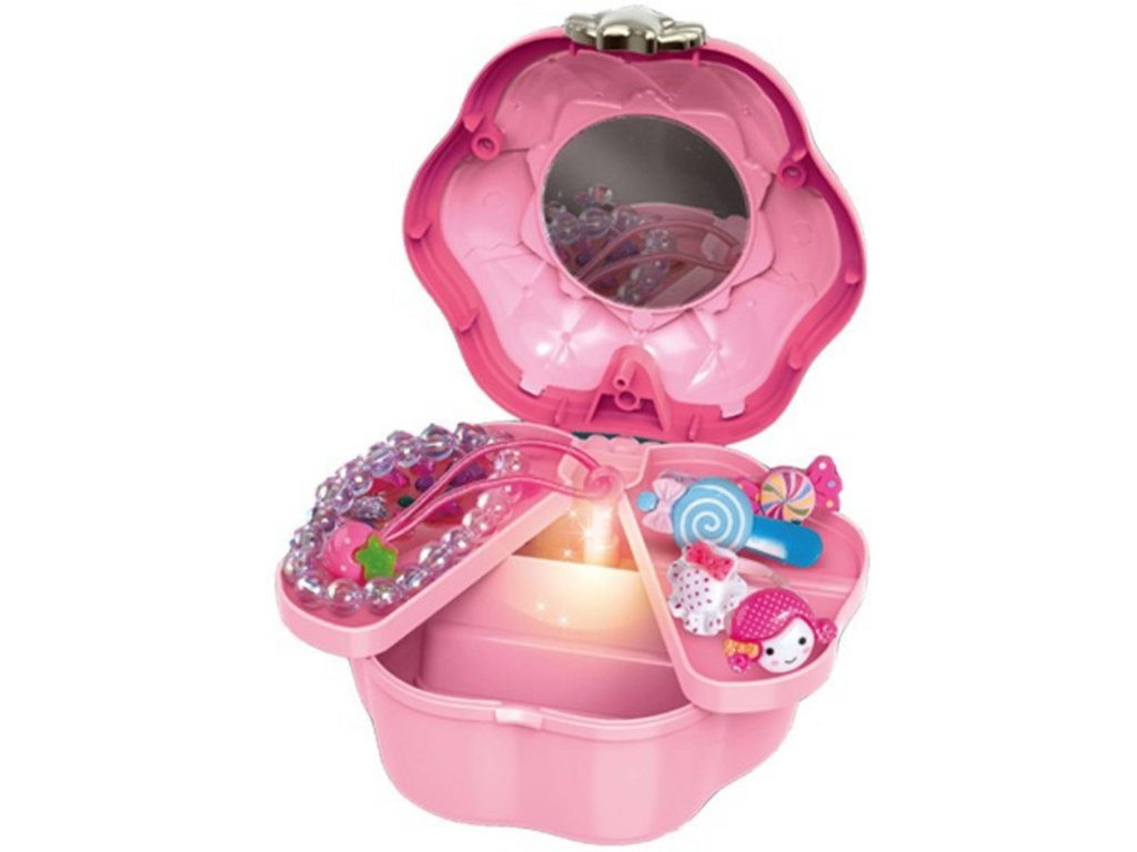 Dětská plastová šperkovnice, hrací skříňka na baterie, se světlem a zvukem, součástí kadeřnické doplňky (hřebínek, sponky, gumička, náramek, prstýnky, zrcátko ...). 3 barevné varianty.
