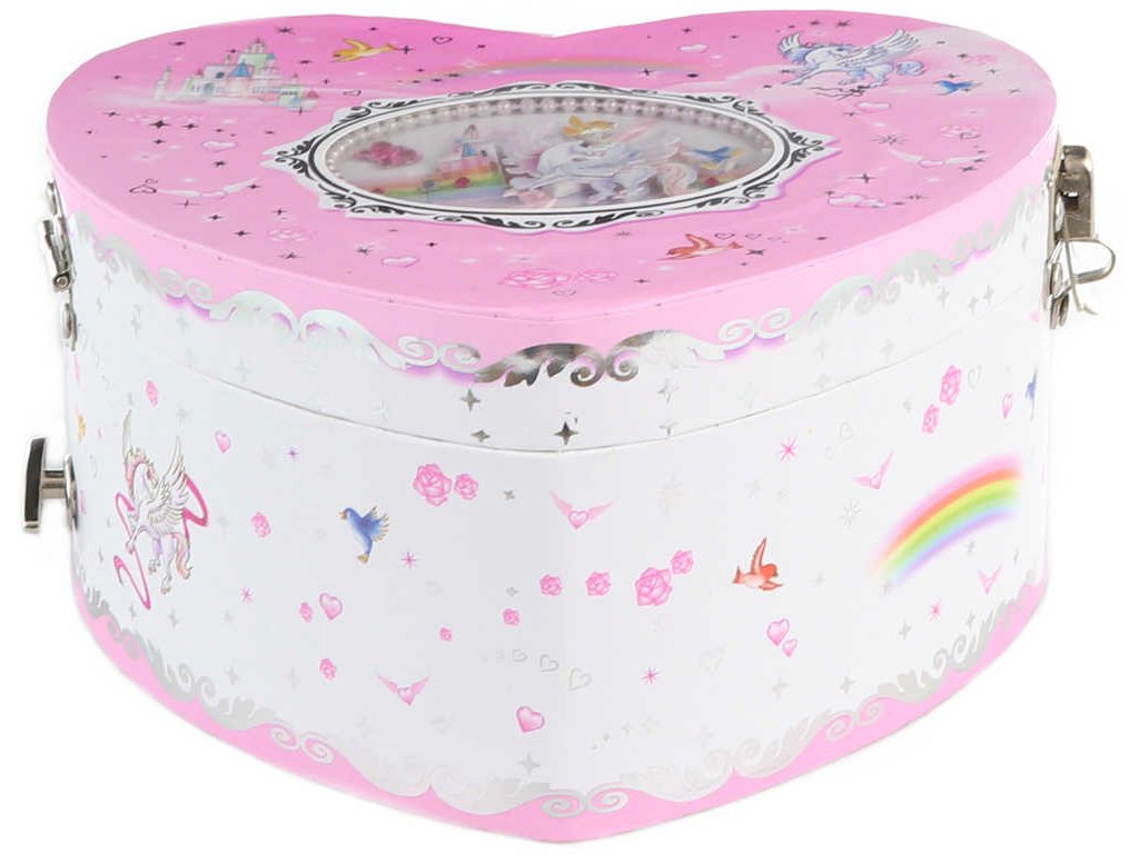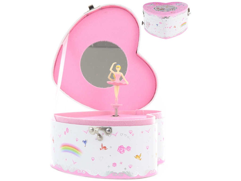 Krásně dekorovaná kartonová hrací skříňka ve tvaru srdíčka - krabička na šperky, s panenkou baletkou. Uvnitř šperkovnice je zrcátko a panenka, která po natažení klíčku a otevření víka šperkovnice, tančí a hraje. Baleno v sáčku.
