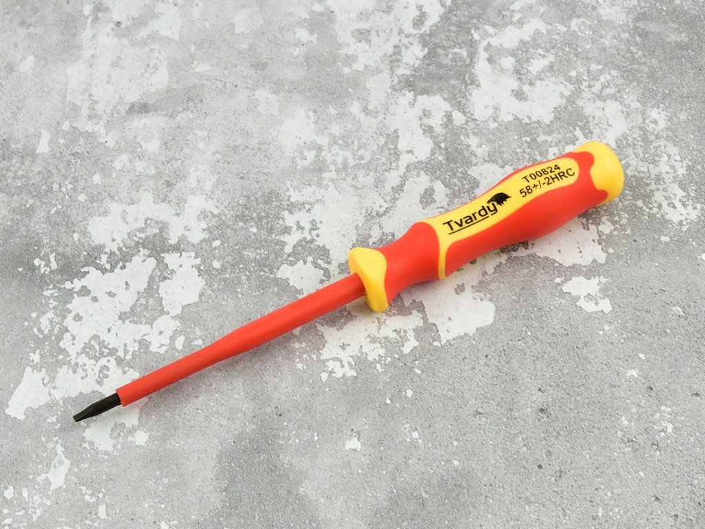Profesionální plochý šroubovák s izolací je určený zejména pro elektrikáře. Jeho ergonomická vícesložková rukojeť zajišťuje účinnou izolaci až do 1000 V a je vhodný pro všechny druhy prací na instalacích nízkého napětí. Hrot šroubováku je vyroben z vysoce kvalitní oceli S2, která byla pro dosažení optimálních parametrů podrobena vhodné tepelné úpravě. Tvrdost čepele je v rozmezí 56-60 HRC. Stopka šroubováku je naproti tomu vyrobena z oceli CRV, která se vyznačuje vyšší pružností.