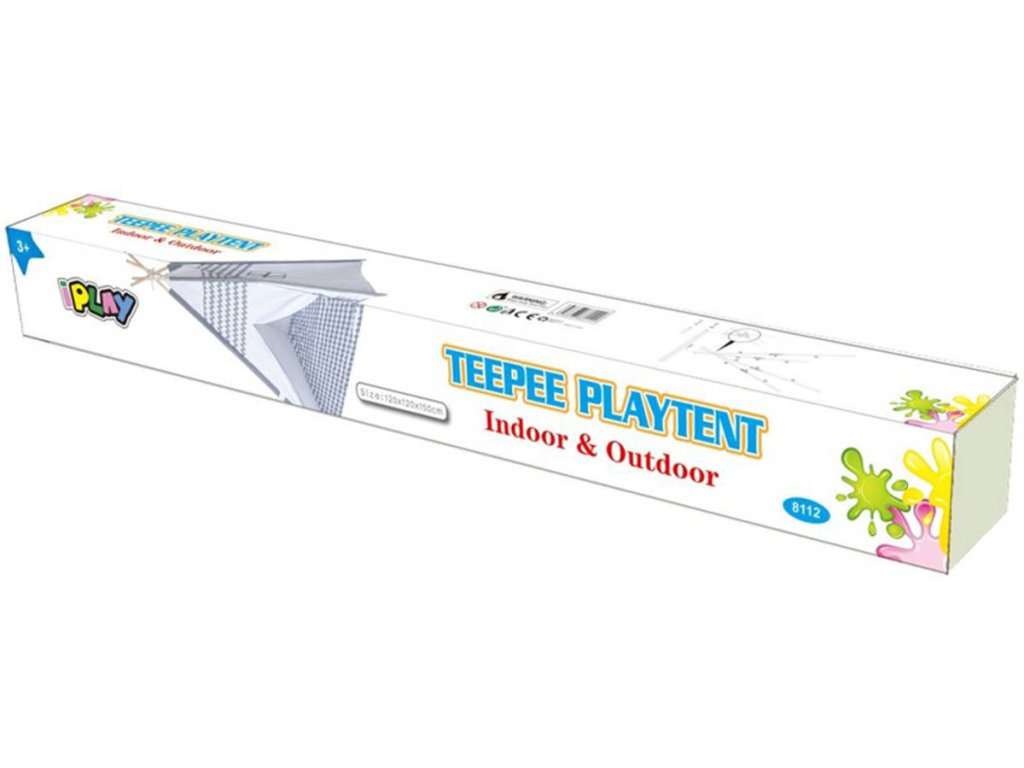 Dětský textilní stan s dřevěnou konstrukcí, indiánské bílo-šedé Teepee s oknem, s potiskem, o velikosti 120x150x120cm.