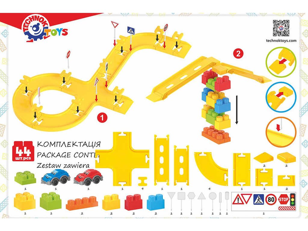 Tato dopravní stavebnice od TechnoK se skládá ze 44 prvků, včetně dráhy s křižovatkami a zatáčkami, svahů, dopravních značek a 2 veselých mini autíček. Stavební kostky jsou velké a dobře uchopitelné pro malé děti. V sadě je 7 dopravních značek pro výuku pravidel silničního provozu. Malým stavitelům pomůže podrobný návod krok za krokem s různými možnostmi sestavení. Baleno v igelitovém pytli.