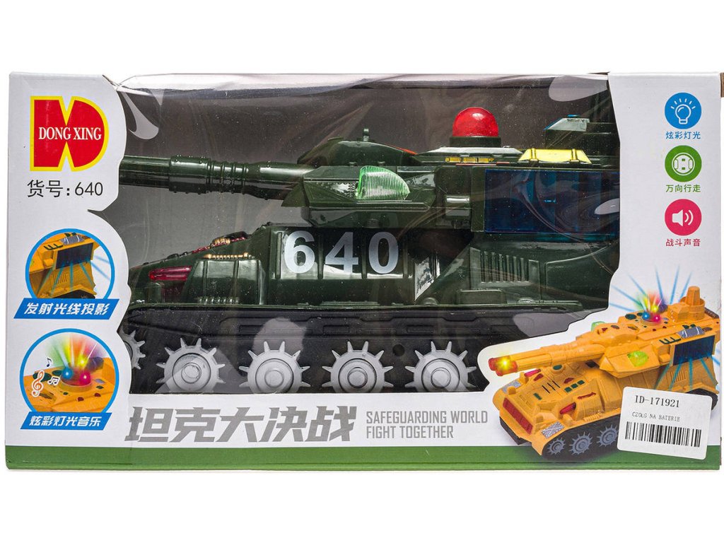 Plastový model obrněného vojenského vozidla s pohonem na setrvačník, ve třech barevných variantách. Pásový tank se světelnými efekty, melodií a hlasem, pro všechny malé vojáky a bojovníky. Hračka na baterie, se světlem a zvukem. Baleno v krabici s průhledem.