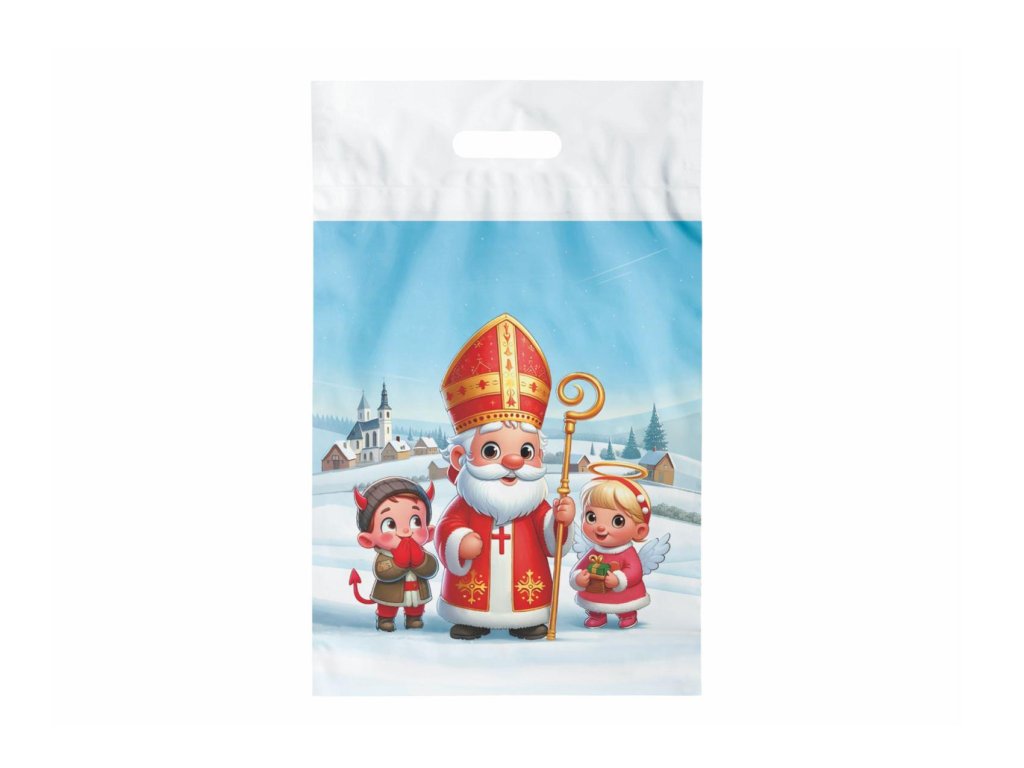Igelitová taška s průhmatem a barevným mikulášským motivem. Je ideální pro různé typy dárků, od malých sladkostí a hraček až po větší předměty. Na tašce je obrázek Mikuláše, anděla a čerta. Taška je vybavena průhmatem, což je otvor v horní části tašky, který slouží jako rukojeť. Tento průhmat umožňuje snadné a pohodlné přenášení tašky. Díky pevnému plastovému materiálu je taška odolná proti roztržení a vlhkosti, čímž zajišťuje, že dárky uvnitř zůstanou v bezpečí a suchu.