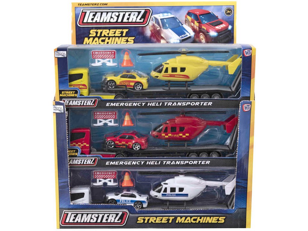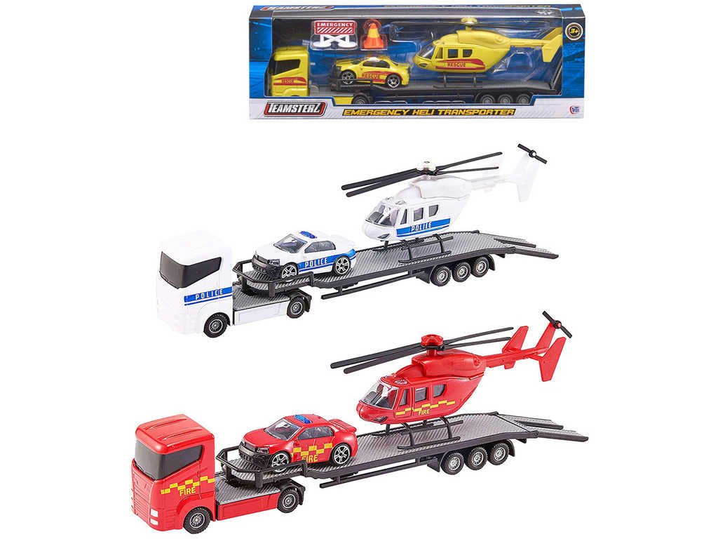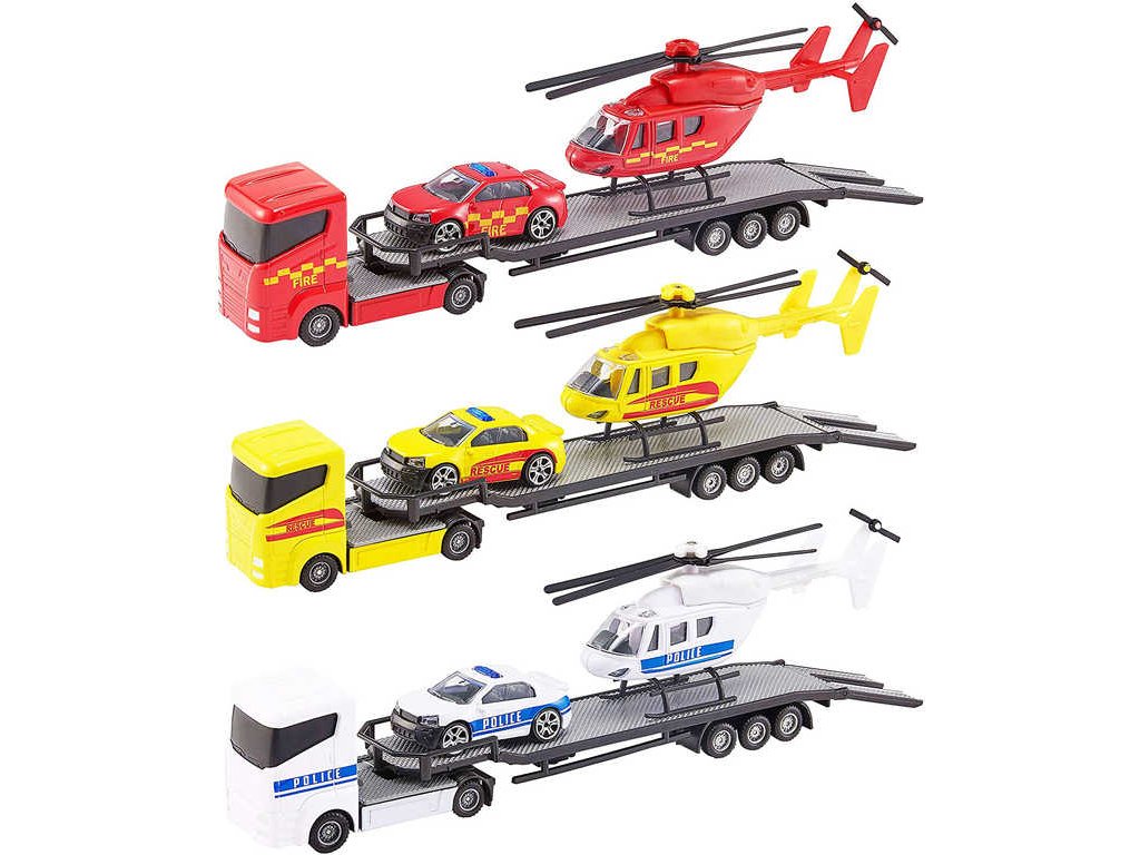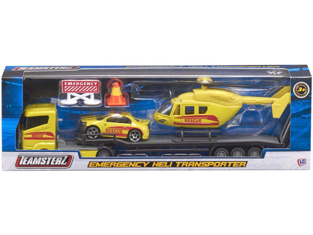 Teamsterz Emergency Heli Transporter - kamion s přívěsem převážející vrtulník a autíčko. Modely z kovu a plastu - záchranné složky, ve třech variantách provedení, pro všechny malé záchranáře,