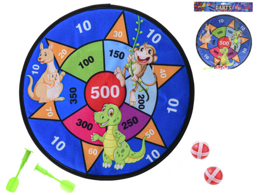 Lehký textilní terč k zavěšení na zeď, s motivem "zvířátka". Součástí jsou 2 míčky a 2 šipky na suchý zip. Oblíbená hra pro děti i dospělé. Úkolem je nasbírat, co nejvíce bodů při házení na terč.