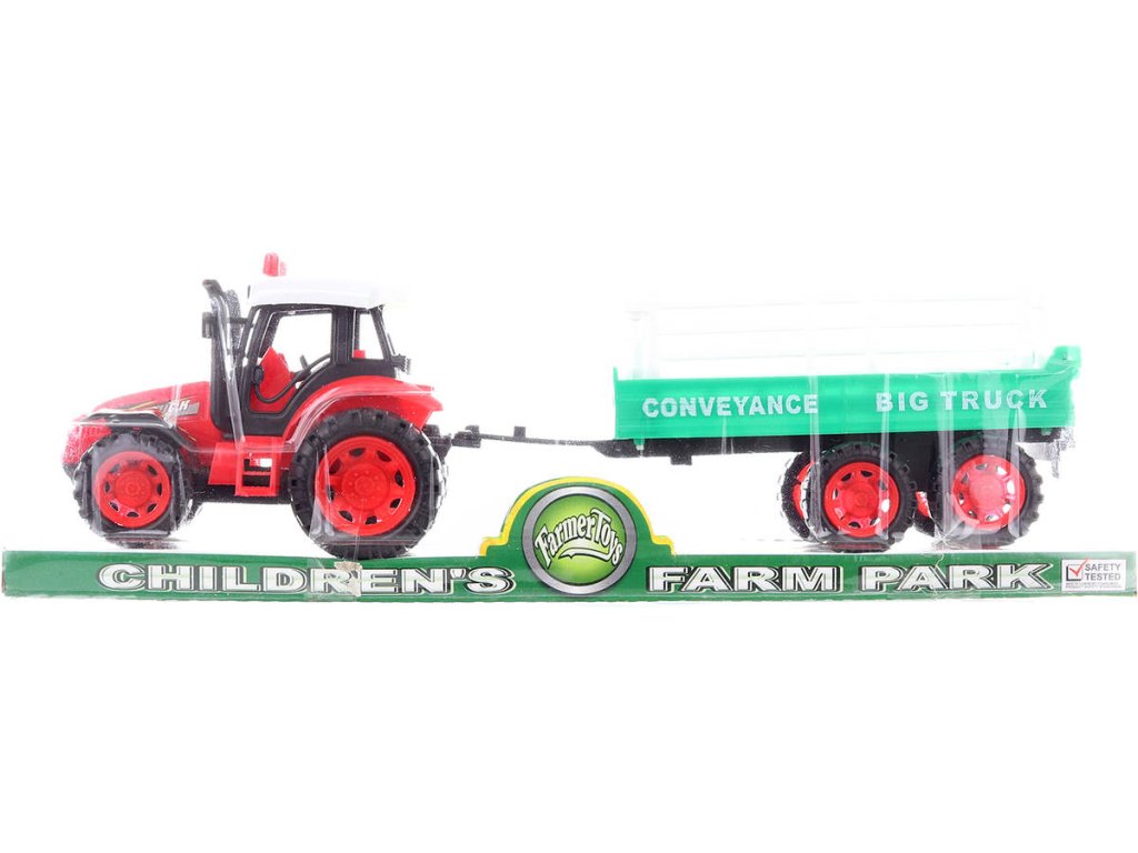 Plastový farmářský traktor s pohonem na setrvačník, s přívěsem, herní set o velikosti cca 32cm, pro všechny malé zemědělce. 2 barevné varianty.