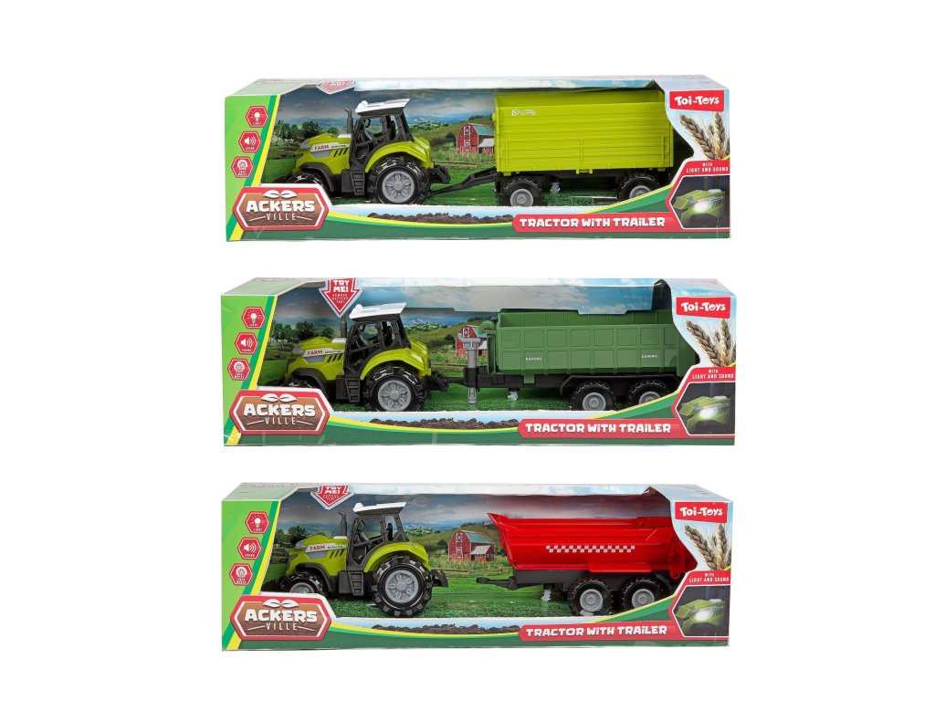 Traktor s vlekem plast 24cm na volný chod na baterie se světlem, zvukem 3 druhy v krabici 29x9cm