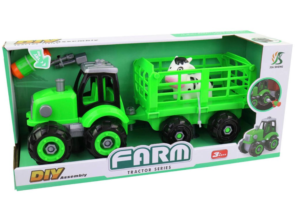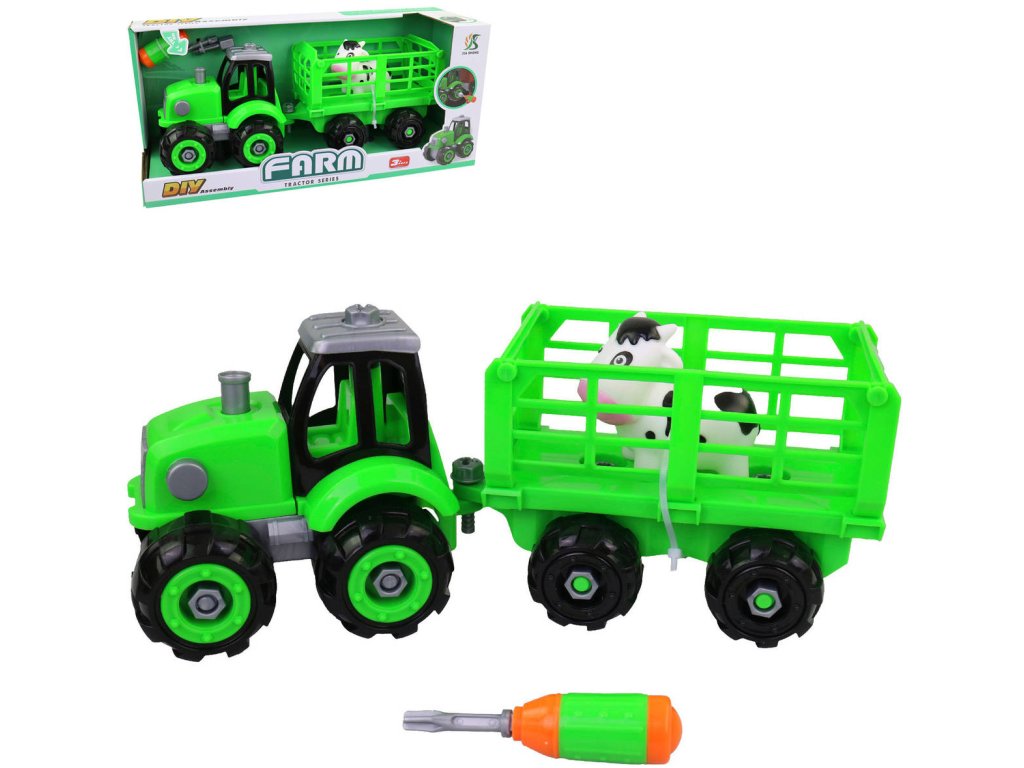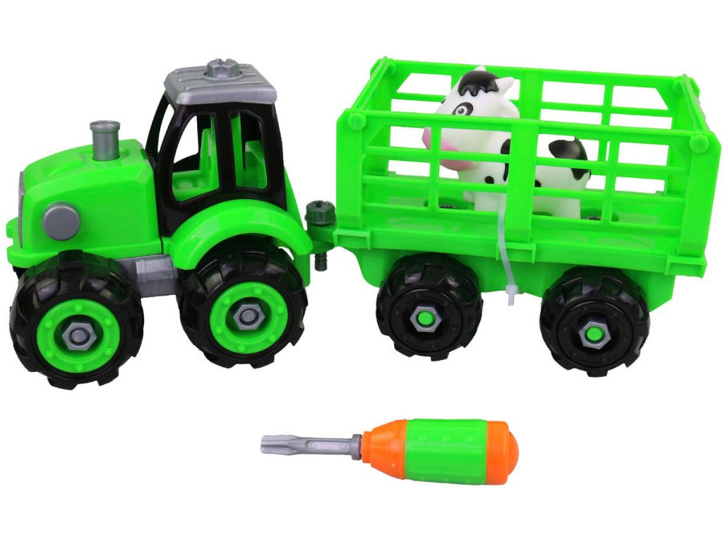 Traktor šroubovací s vlečkou montážní set s nástrojem a zvířátkem na baterie