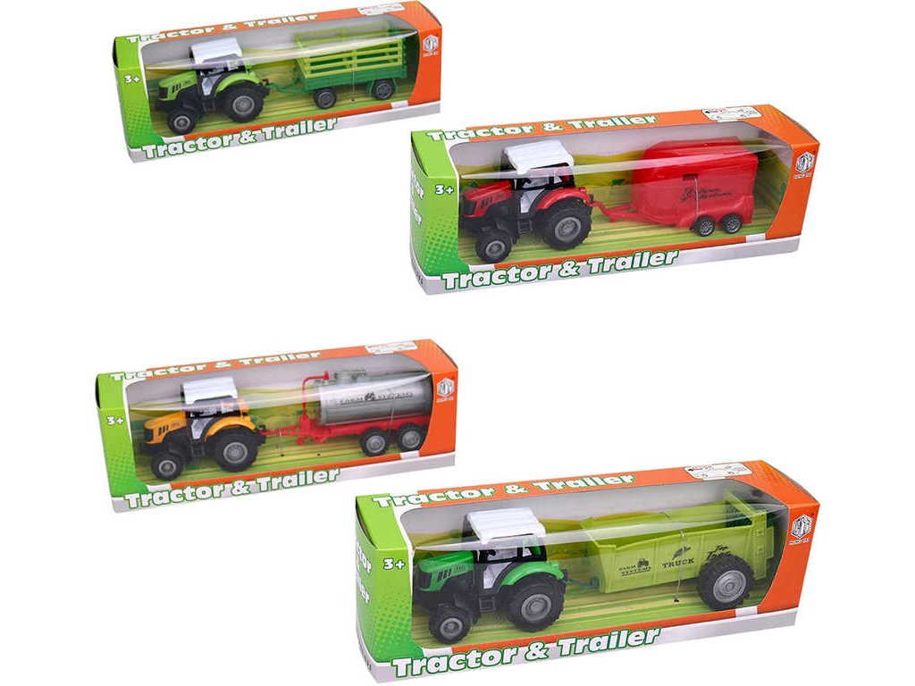Kovový model traktoru s přívěsem ve čtyřech variantách provedení, s pohonem na zpětné natažení, pro všechny malé zemědělce a farmáře. Baleno v krabici.