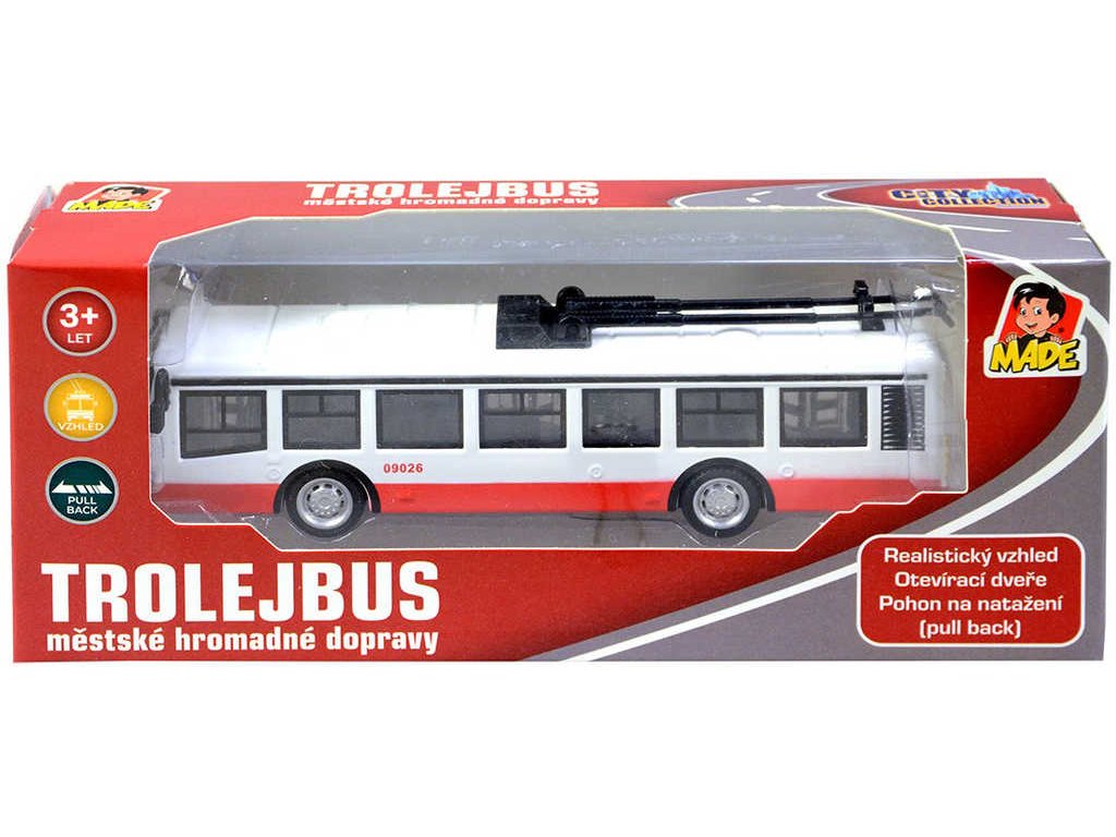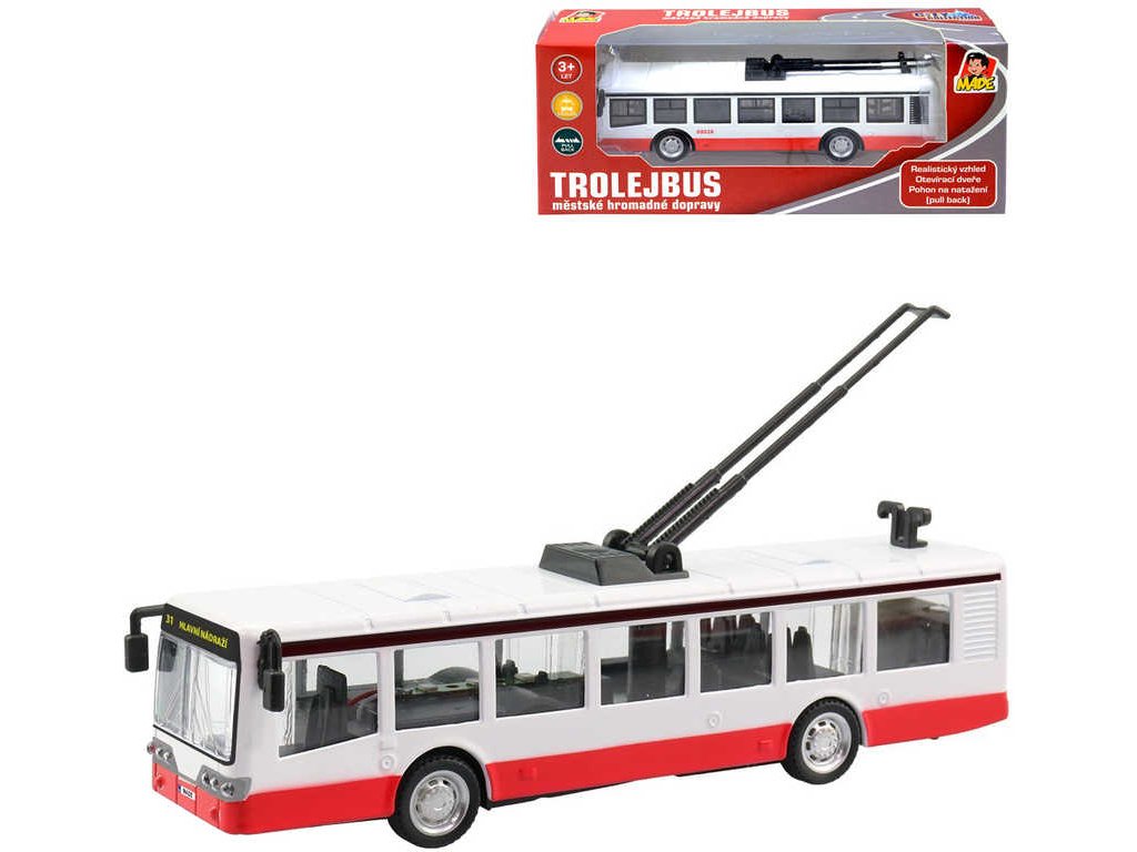 dopravy v některých našich městech. Trolejbus má výklopné troleje, otevírací dveře. Pohon je na zpětné natažení. Baleno v krabici.