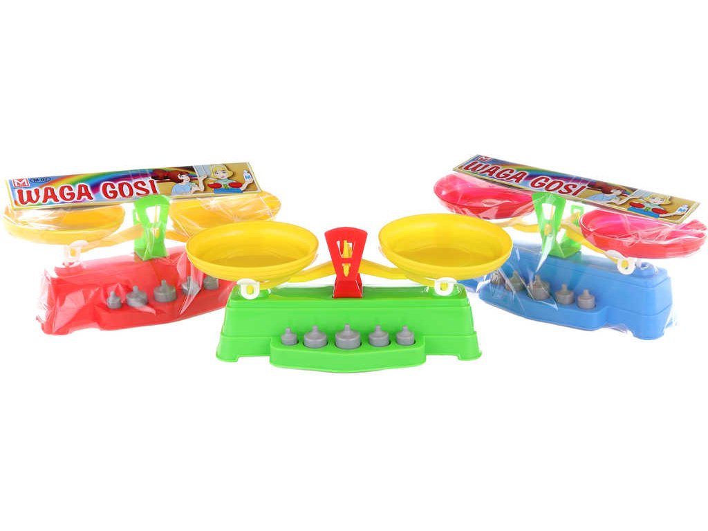 Barevná klasická dvouramenná stolní váha pro děti, se dvěma miskami z plastu, se závažím, pro všechny malé kuchařky či jako doplněk ke hře na obchod, pro všechny malé prodavače. Obsahuje také 5ks závaží. Hračka ve