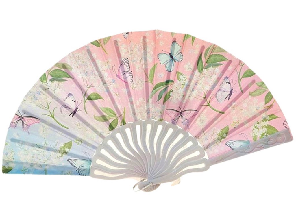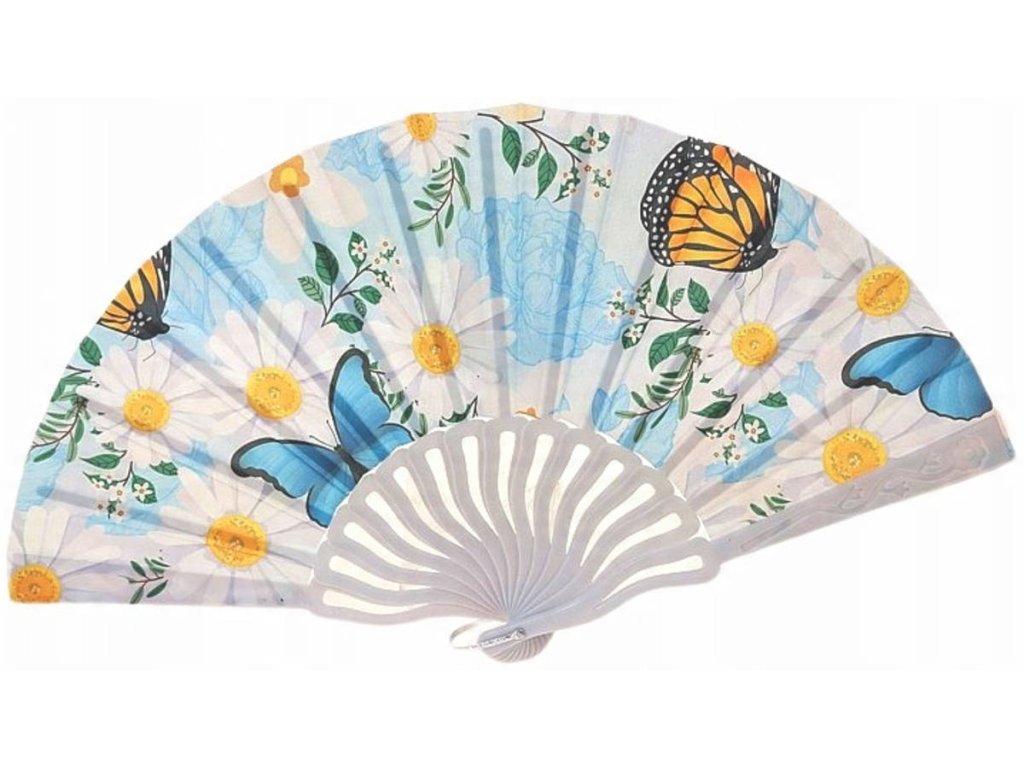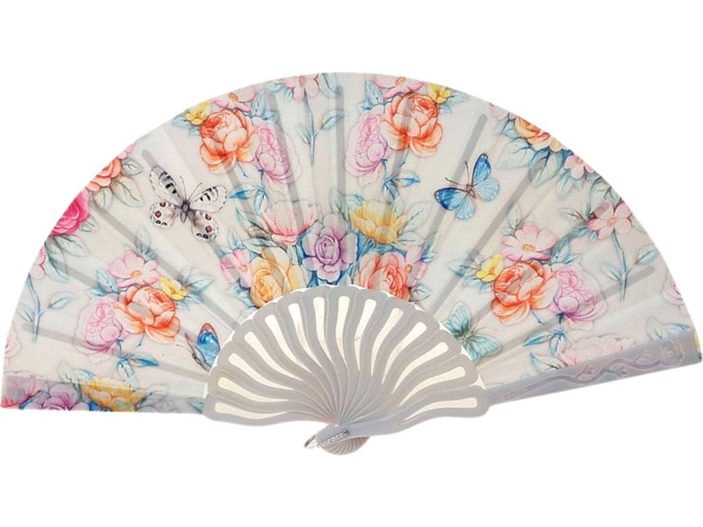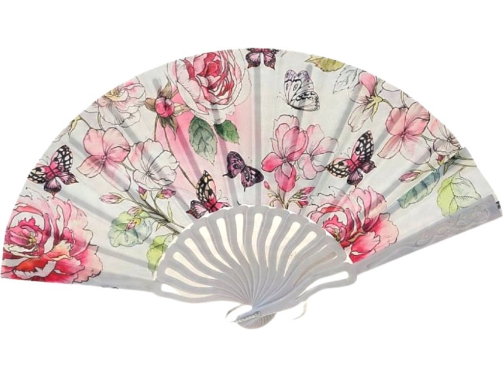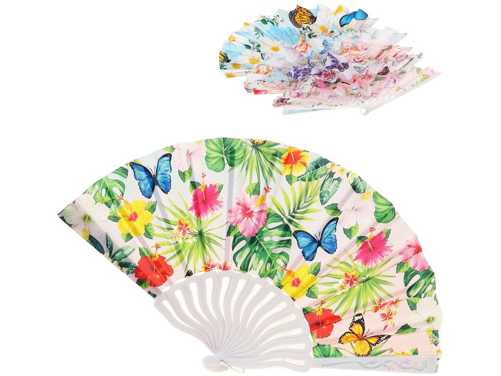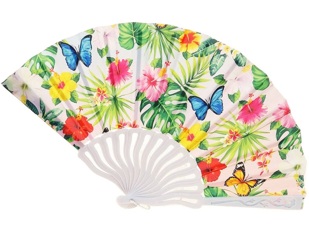 Pestrobarevný dětský vějíř z plastu a textilu, s potiskem s květinami a motýly, v šesti různých motivech. Velikost po rozložení 43cm. Lze použít jako součást karnevalového kostýmu.