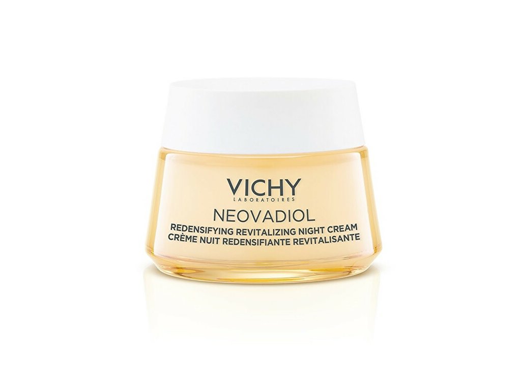 Hormonální změny v období kolem menopauzy urychlují stárnutí pleti, která ztrácí elasticitu a hutnost. Kontury jsou méně vyrýsované. Návaly horka mohou způsobovat nepříjemné pocity na pleti. Laboratoře Vichy vyvinuly lehký, osvěžující noční krém s obsahem Termální vody Vichy vulkanického původu obohacené o 15 minerálů, Proxylanu, výtažku z kasie a kyseliny hyaluronové. Lehký a svěží gelový krém s okamžitým chladivým efektem pomáhá vyhladit pokožku a zároveň zvyšuje jas pleti.
