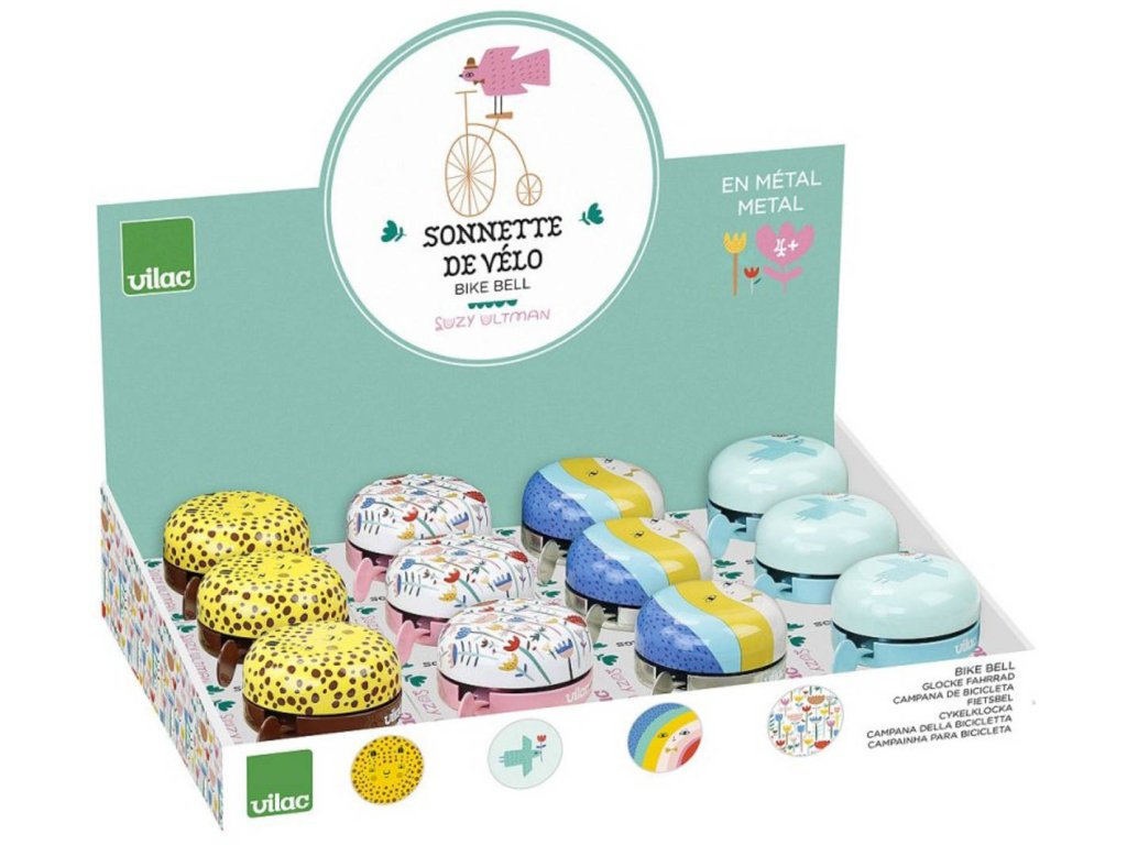 Krásný kovový zvonek na kolo od francouzské značky Vilac navržený Suzy Ultman. Rozvoňte své kolo těmito krásnými retro zvonky na kolo pro děti. 4 veselé designy. Velikost 6cm.