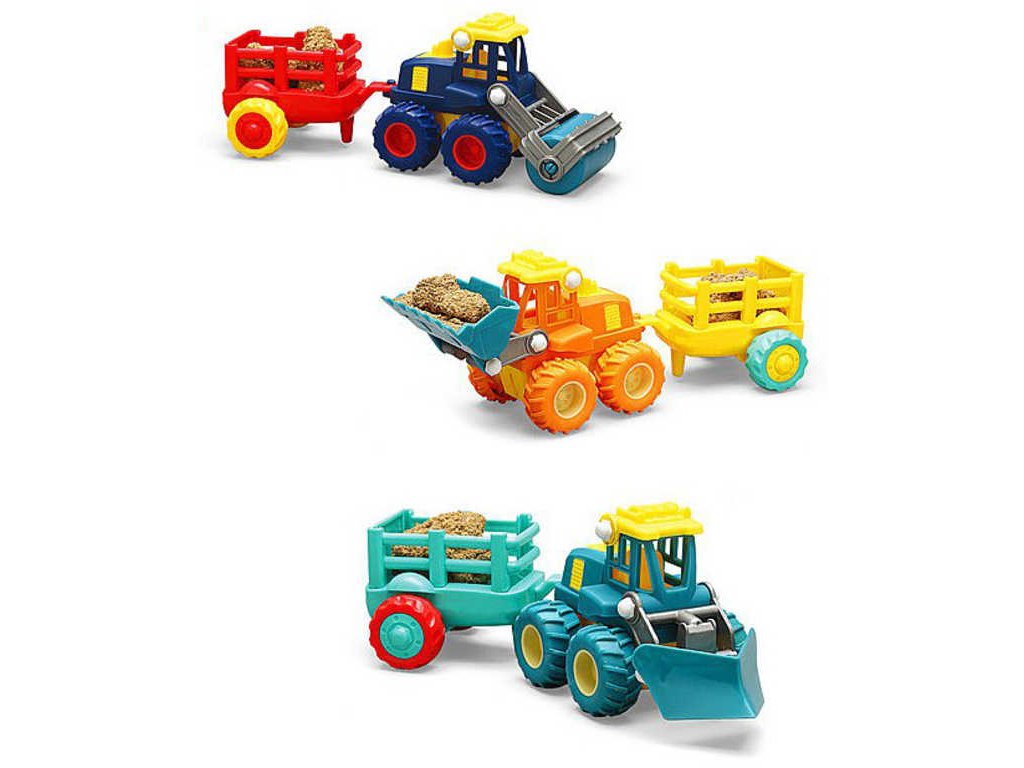 Barevný pracovní stroj s vlečkou, s pohonem na setrvačník, pro ty nejmenší stavitele. Pogumovaná kolečka. Funkční prvky. Plastový herní set ve třech variantách provedení. Baleno volně.