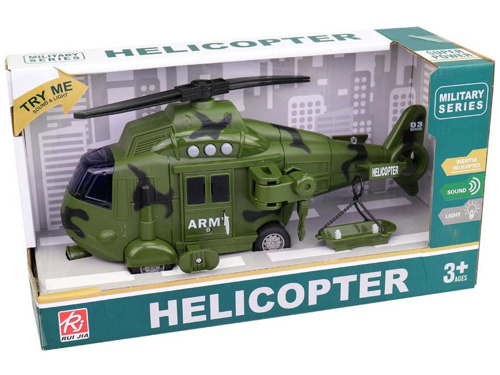 Parádní plastový model vojenského vrtulníku s funkčním navijákem, s nosítky, ve dvou barevných variantách, pro všechny malé záchranáře. Baleno v open boxu.