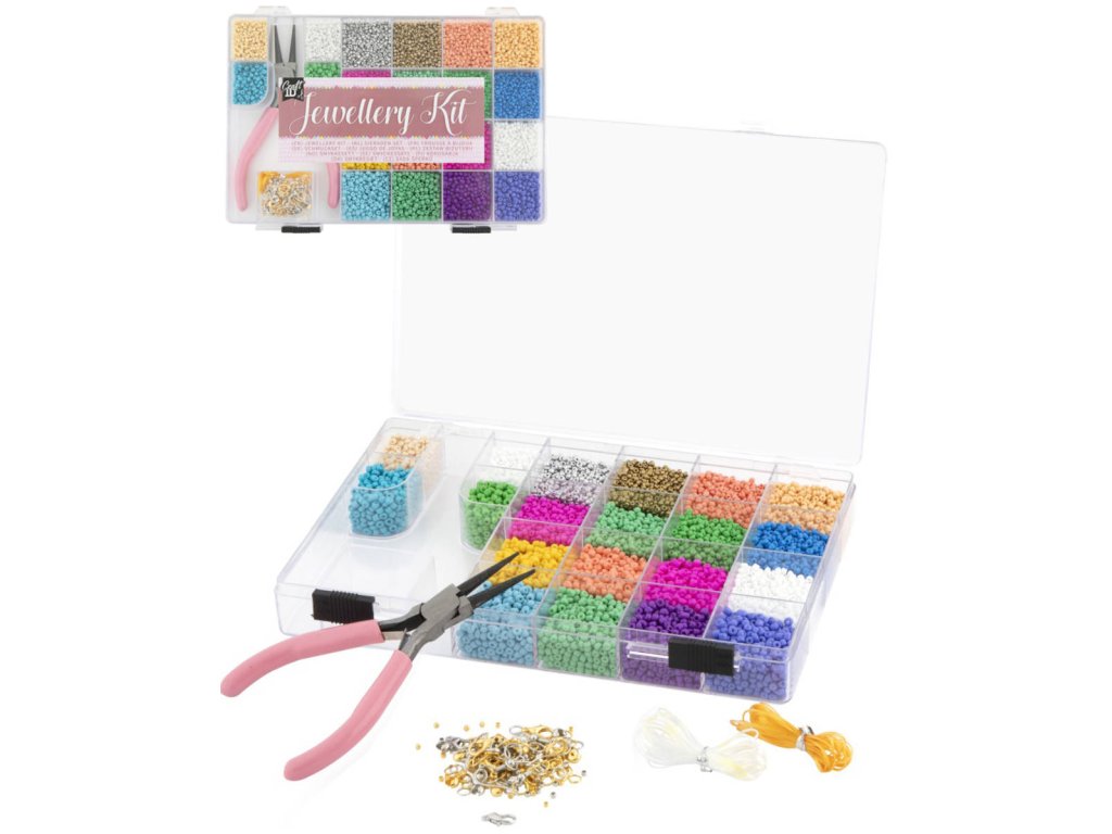 Výroba šperků - Velký dětský kreativní set, součástí 20 barev korálků, kleštičky, zlaté a stříbrné zapínání a spojky + zlaté a stříbrné lanko k navlékání. Baleno v průhledném úložném boxu.