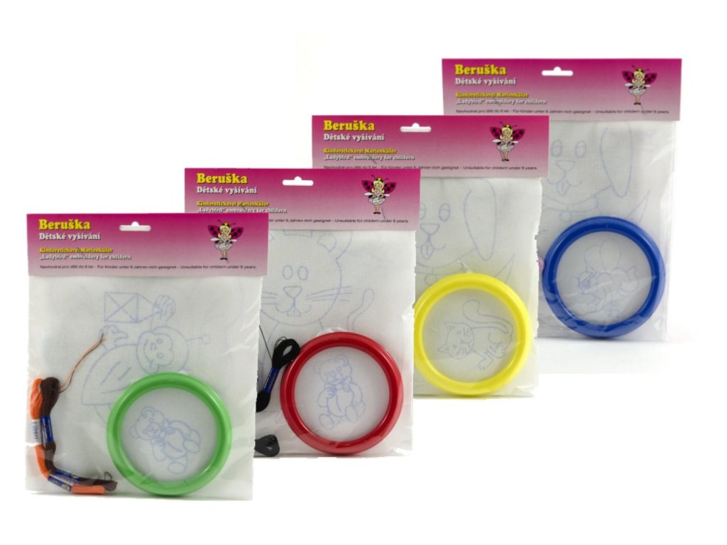 Kreativní set na vyšívání pro všechny šikovné holčičky a malé švadlenky. Sada obsahuje plastový rámeček s napnutým plátýnkem s předtištěným obrázkem, dva další obrázky na vyšití a čtyři bavlnky ve čtyřech různých barvách v sáčku. Sada v několika barevných kombinacích bavlnek a rámu, a v několika motivech obrázku.
