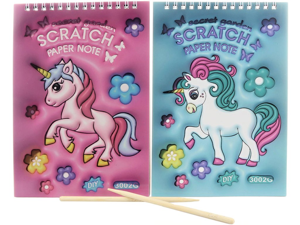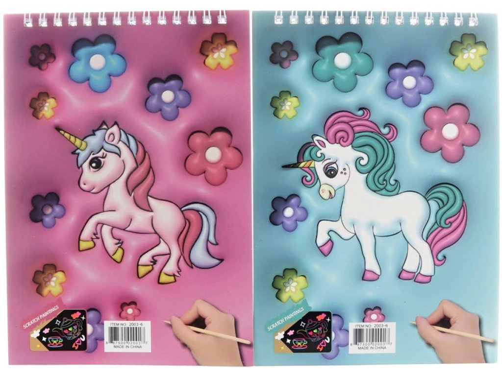 Vyškrabovací sešit s kroužkovou vazbou, s motivem Jednorožci. Obsahuje 8 černých listů k vyškrabání, s barevným podkladem a dřevěné rydlo. 2 varianty provedení.