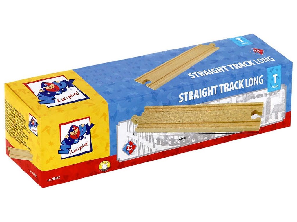 Sada dvou kusů dlouhých, rovných kolejí k vláčkodráhám Woody. Části jsou vyrobeny ze dřeva nejvyšší kvality. Koleje jsou kompatibilní i s jinými dřevěnými vláčkodráhami. Baleno v krabici.