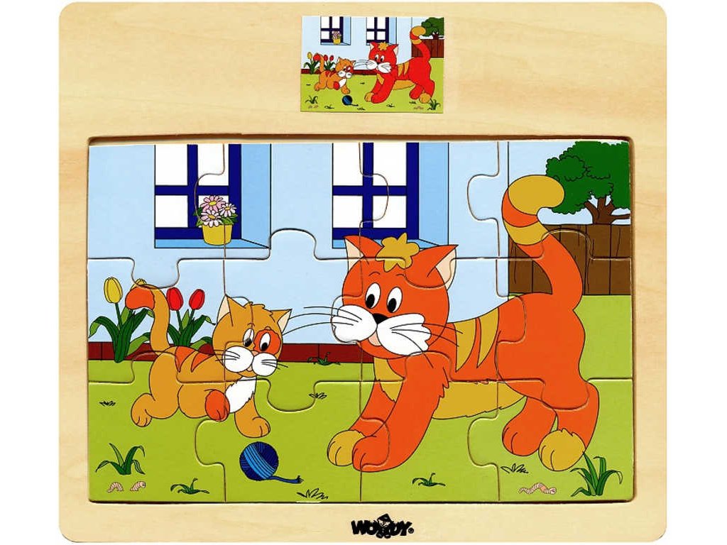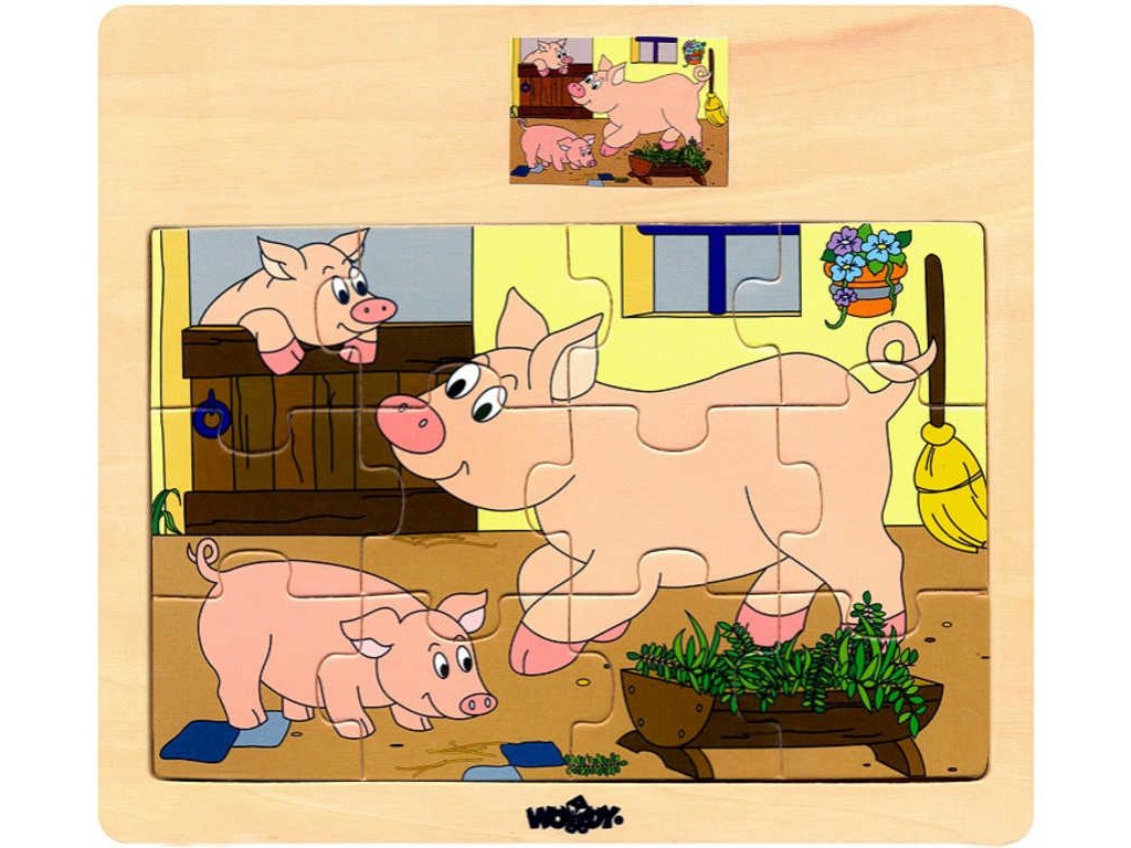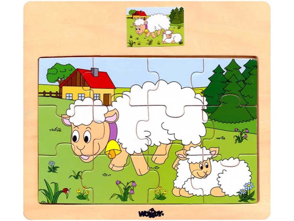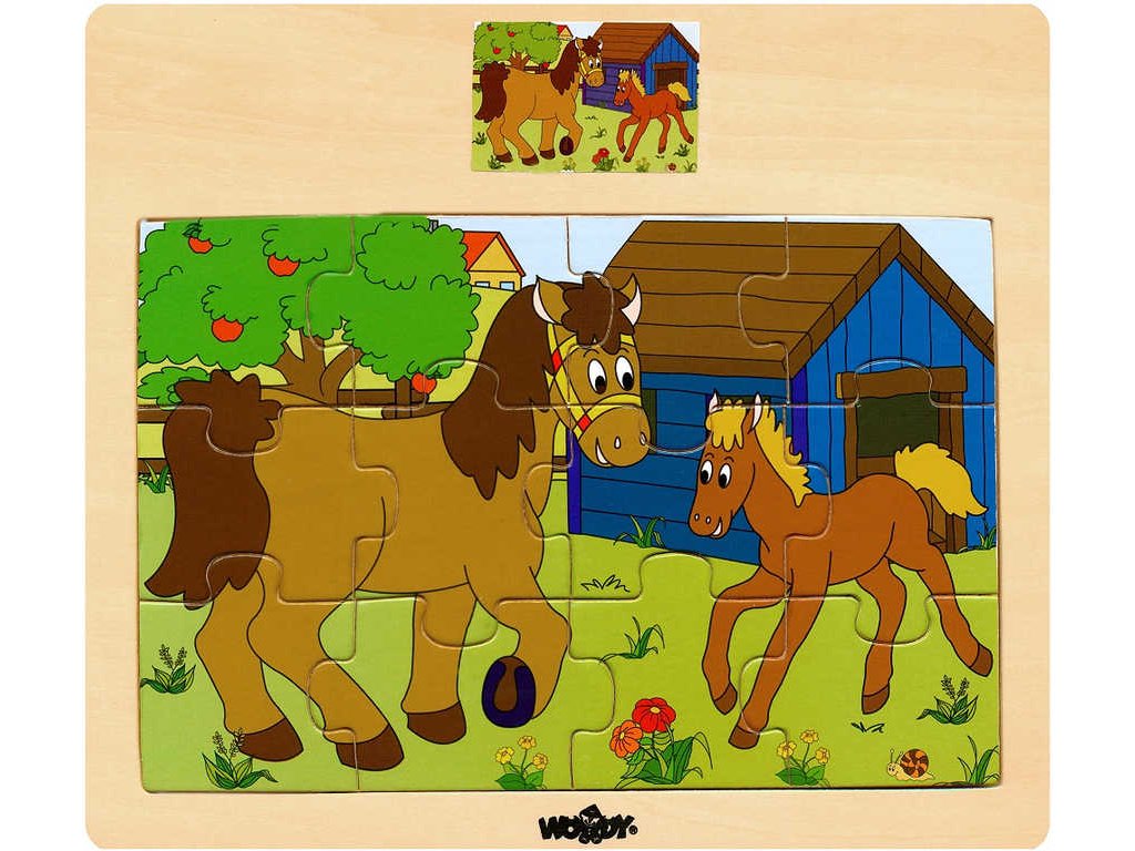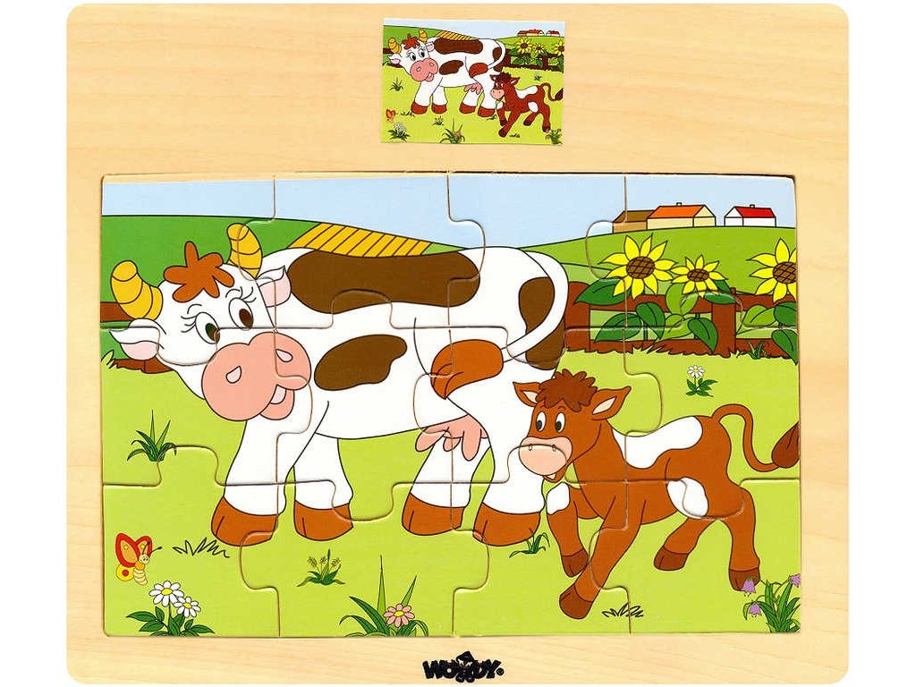 Klasické zámkové dřevěné puzzle ze dřeva umístěné ve dřevěném rámu s motivy domácích zvířat a zvířátek z farmy, a jejich mláďat, určené pro nejmenší děti. 6 různých provedení skládačky po 12ti dílcích - Psík a štěňátko, Kůň a hříbátko, Kráva a telátko, Prase a selátko, Kočka a koťátko, Ovce a jehňátko