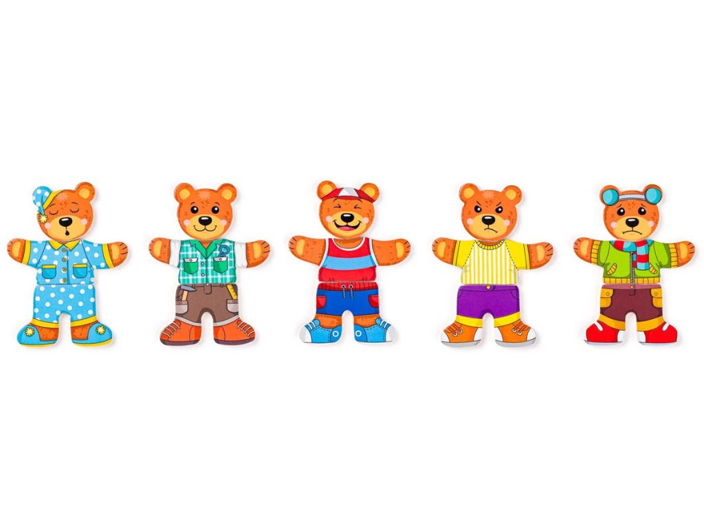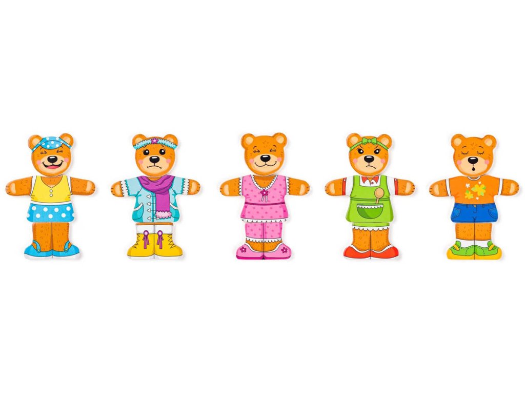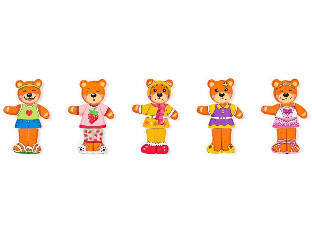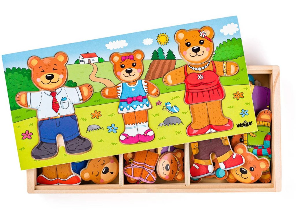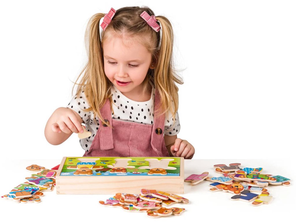 Jednou z forem hry s puzzlemi jsou tzv. šatní skříně, kde děti mají možnost si dle vlastní fantazie oblékat a měnit postavičky medvídků. Zabaleno v praktické dřevěné krabičce. Rozvijí schopnost logického myšlení a vývoj fantazie.