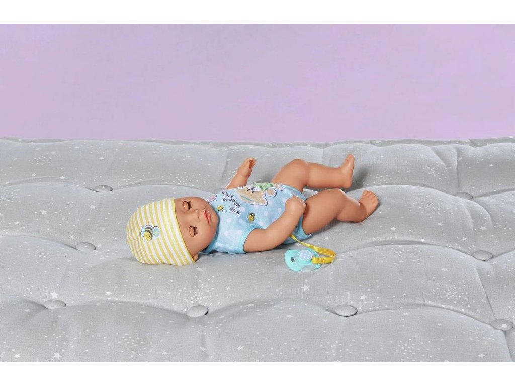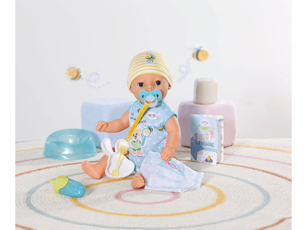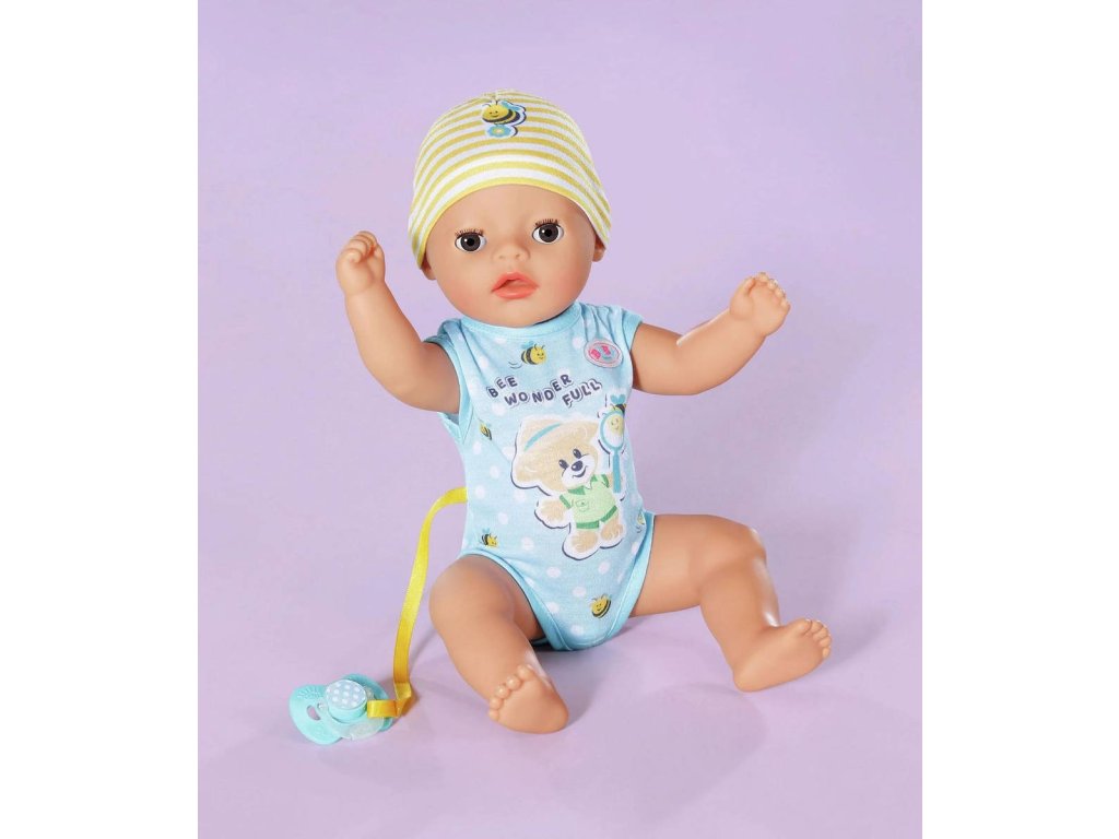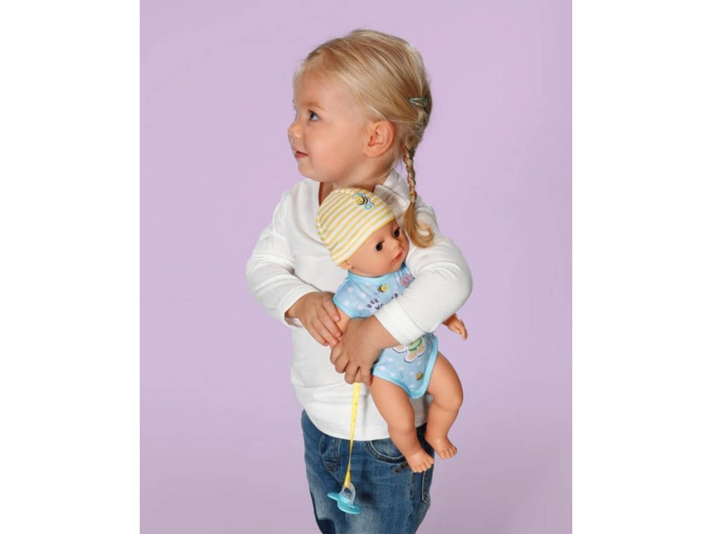 BABY born Little, chlapeček, má 7 skvělých funkcí, které fungují bez baterií. Je dodáván se vším, co potřebuje. Může pít vodu z lahvičky, nechat se přebalovat nebo chodit na modrý nočník. Když dostane dudlík, který je stužkou připevněn k dupačkám, kouzelně se mu otevřou nebo zavřou oči. Pokud dudlíkem otočíte doleva, zavře oči, pokud jím otočíte doprava, oči otevře. Pokud ho uložíte ke spánku do jeho postýlky, zavře oči i bez dudlíku. Má pohyblivé ruce, nohy a hlavu a převlékání oblečků je tak zábavnou dětskou hrou. Díky velikosti 36 cm je vhodný pro malé ručičky dětí od jednoho roku a je ideální panenkou pro začátky hraní si s panenkou - miminkem. Mohou spolu se svou malou maminkou dokonce sedět každý na svém nočníku a BABY born dětem pomůže při učení se na nočník.