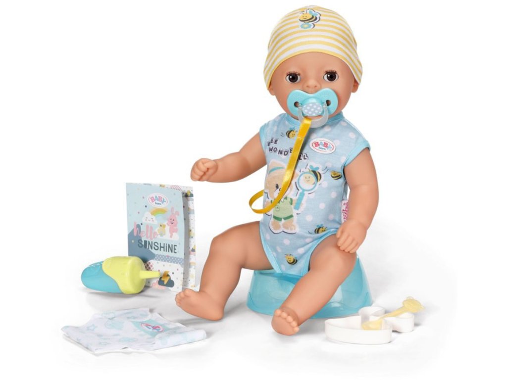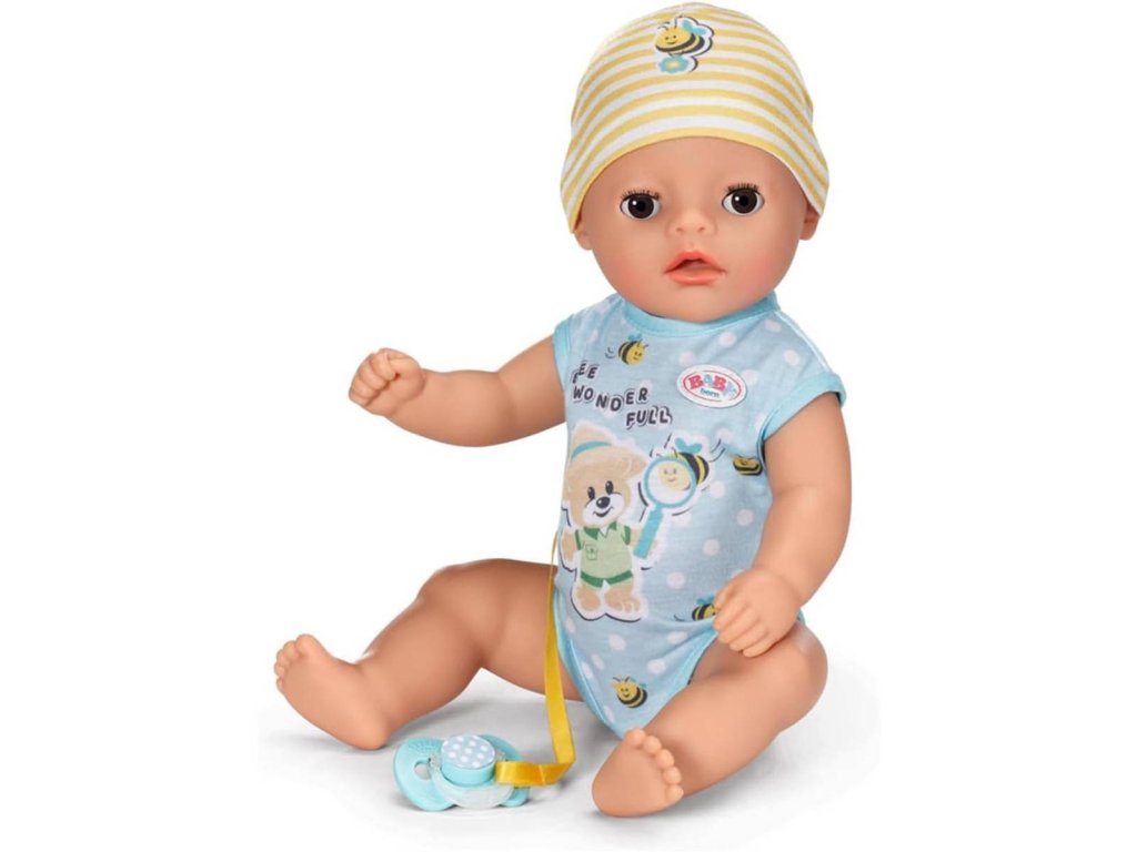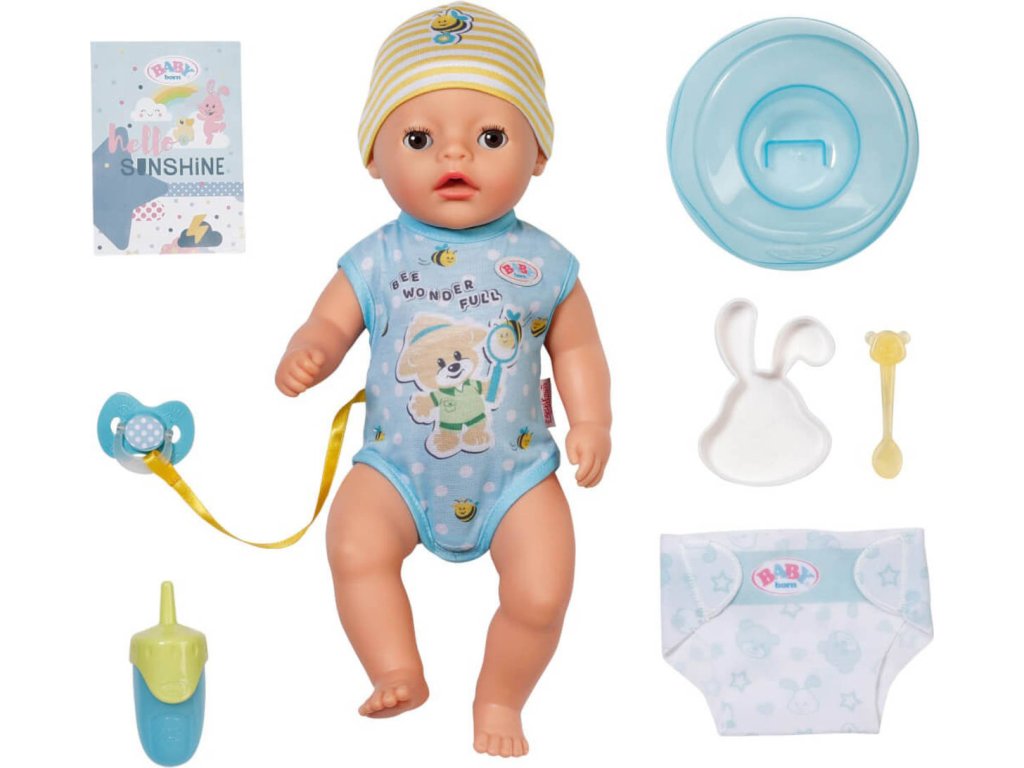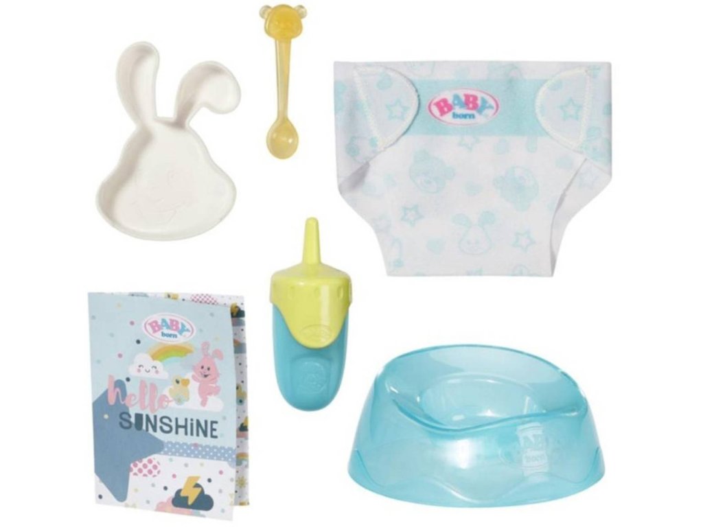 BABY born Little, chlapeček, má 7 skvělých funkcí, které fungují bez baterií. Je dodáván se vším, co potřebuje. Může pít vodu z lahvičky, nechat se přebalovat nebo chodit na modrý nočník. Když dostane dudlík, který je stužkou připevněn k dupačkám, kouzelně se mu otevřou nebo zavřou oči. Pokud dudlíkem otočíte doleva, zavře oči, pokud jím otočíte doprava, oči otevře. Pokud ho uložíte ke spánku do jeho postýlky, zavře oči i bez dudlíku. Má pohyblivé ruce, nohy a hlavu a převlékání oblečků je tak zábavnou dětskou hrou. Díky velikosti 36 cm je vhodný pro malé ručičky dětí od jednoho roku a je ideální panenkou pro začátky hraní si s panenkou - miminkem. Mohou spolu se svou malou maminkou dokonce sedět každý na svém nočníku a BABY born dětem pomůže při učení se na nočník.