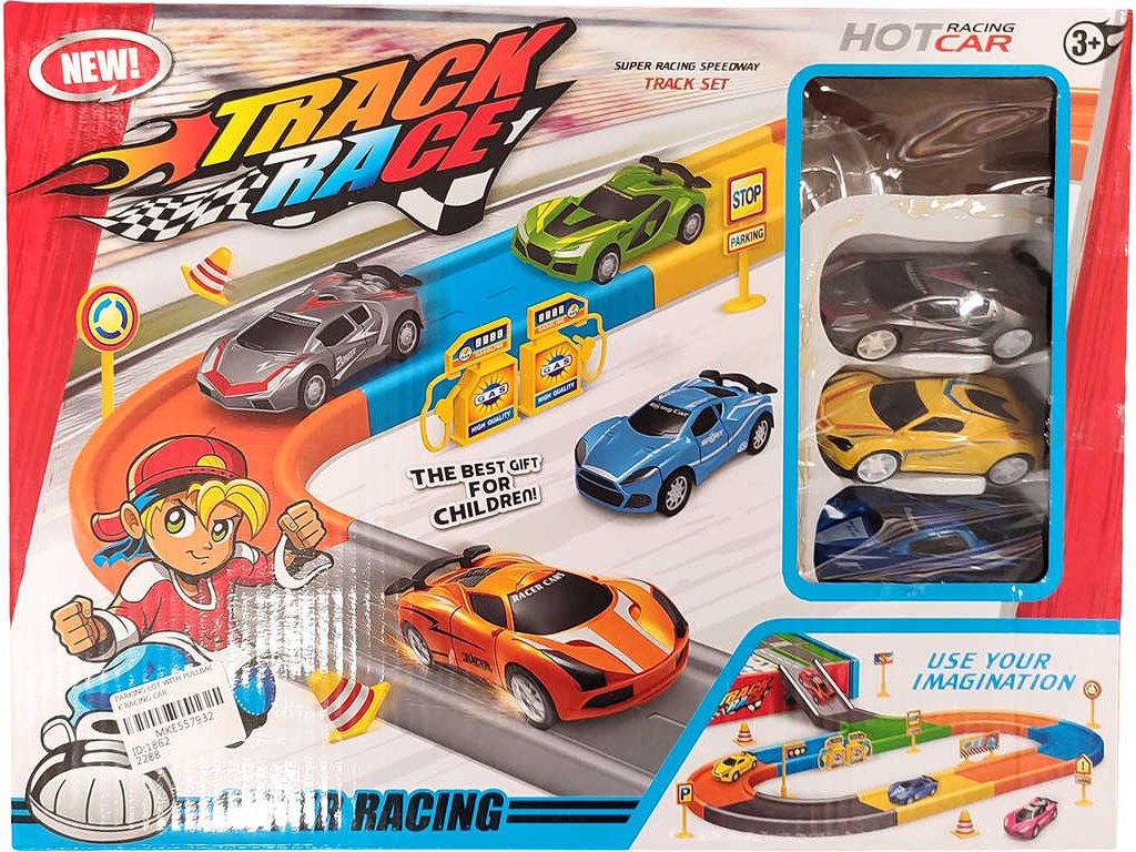 Závodní dráha herní set se 4 autíčky na zpětné natažení plast